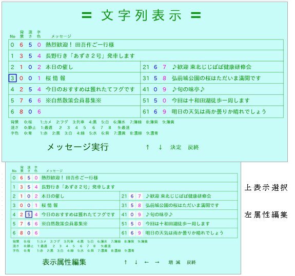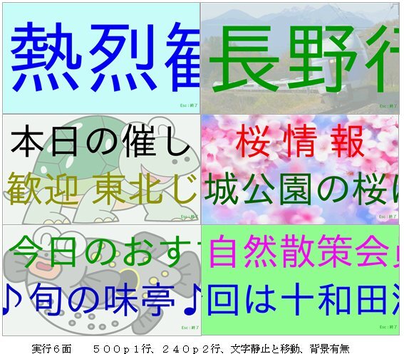 ●500ポイント1行表示、240ポイント2行表示、背景イメージの有無、文字色と移動速度設定などイベント案内を想定した7種類表示のデモソフトのソースプログラムを添付します。自由にメッセージを変更できます。表示中はBGMが流れます。B/B+/B2/B3で動作しますが、機種の差が出てB/B+では遅い表示速度にしても少しチラつきがあります。背景や静止文字はキレイに表示されます。プログラム起動後はすべてスイッチ回路で操作します。