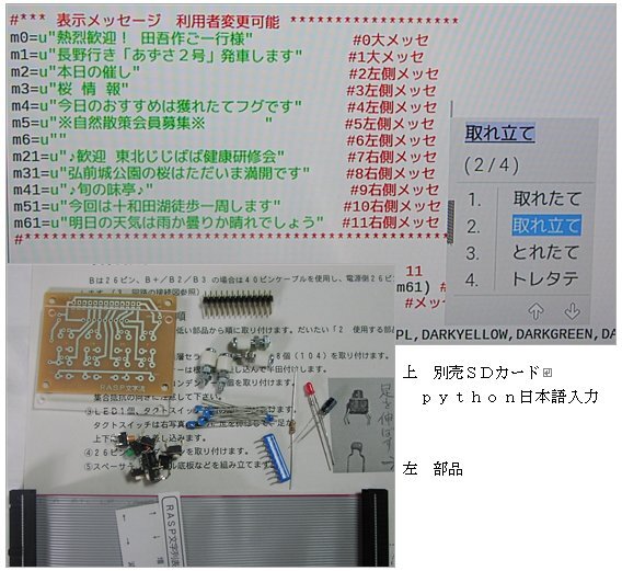 ●ラズベリーにOS(Raspbian)をインストールするとpythonもインストールされます。ver2あるいはver3で動作します。メッセージの変更は直接ソースプログラムを変更します。そのため日本語環境が必要ですが、ネット情報による日本語環境作成はテキストエディタでの日本語入力ばかりで、python(pygame)エディタでの日本語入力はできません。別売のSDカードではこれができて(4枚目写真)、プログラム変更後そのまま実行できるようにしました。SDカードにはスイッチ回路使用とキーボード使用の2つのソースプログラムを入れてあります。