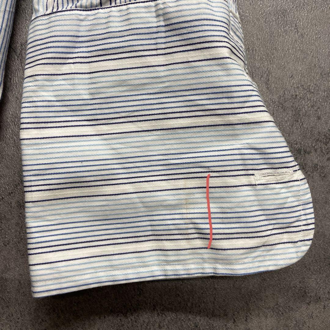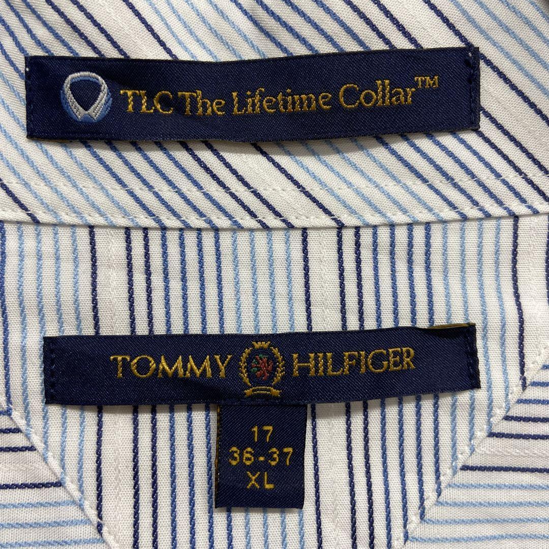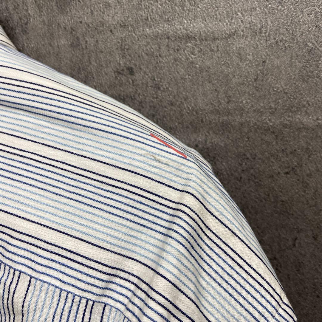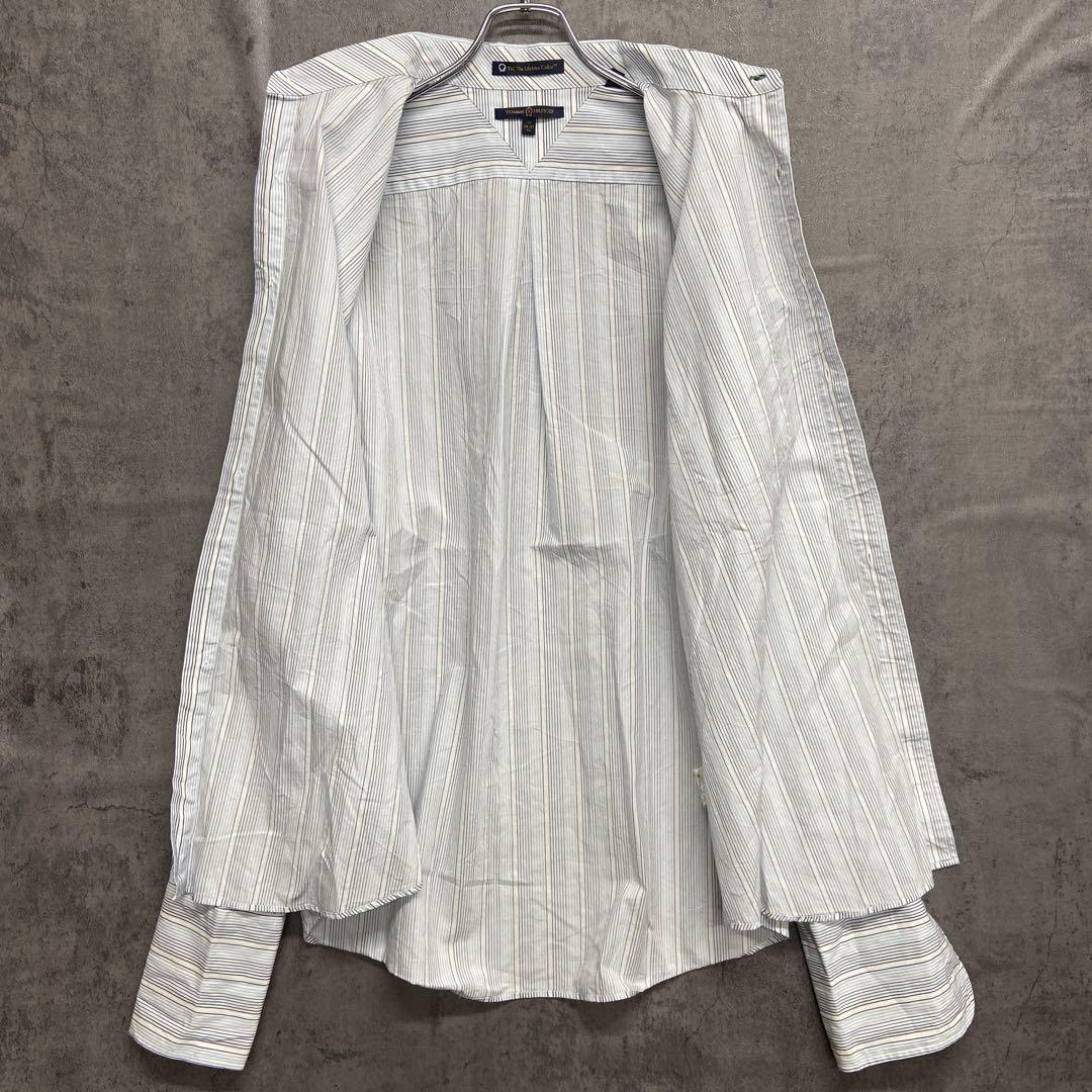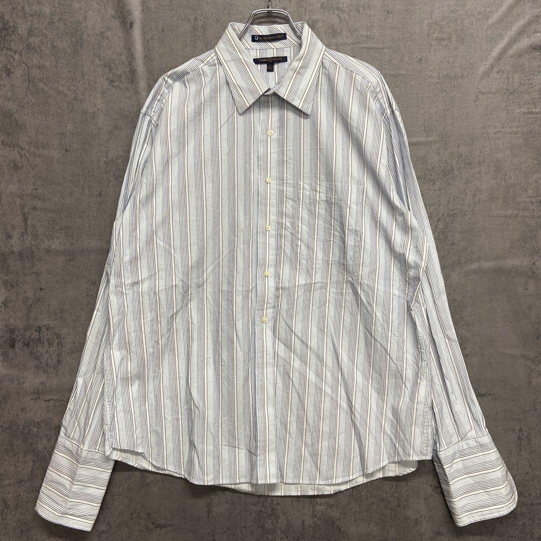 爽やかな白地にブルー系ストライプが映えるトミーヒルフィガーの長袖シャツです。袖口や脇部分にシミが見られますが、人気ブランドのUSA古着です。
