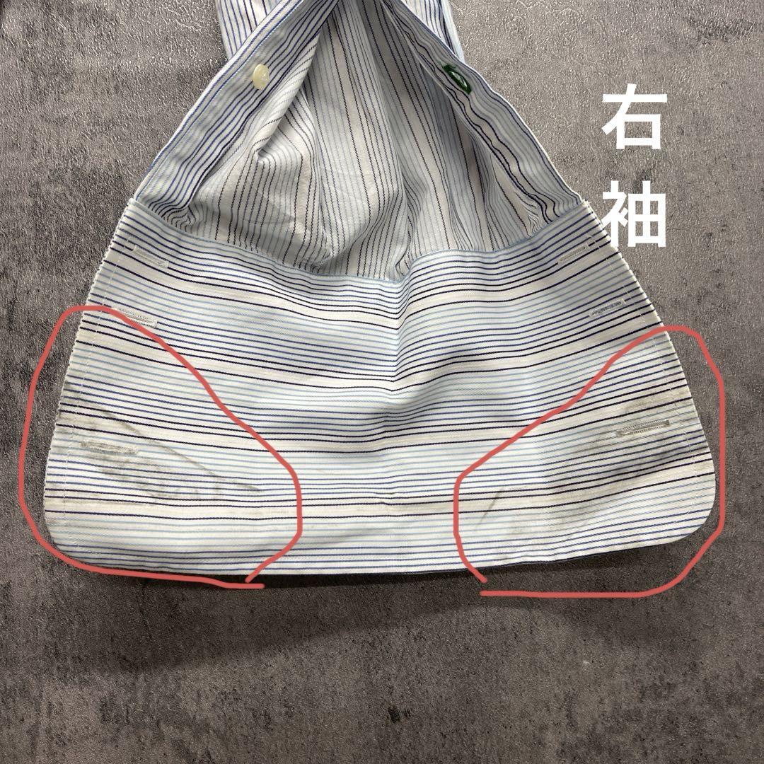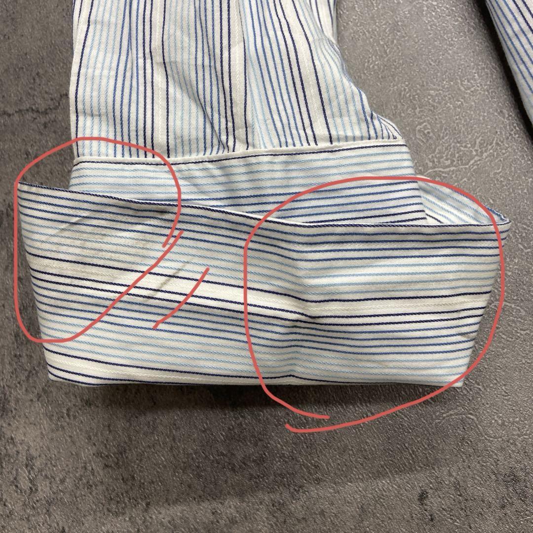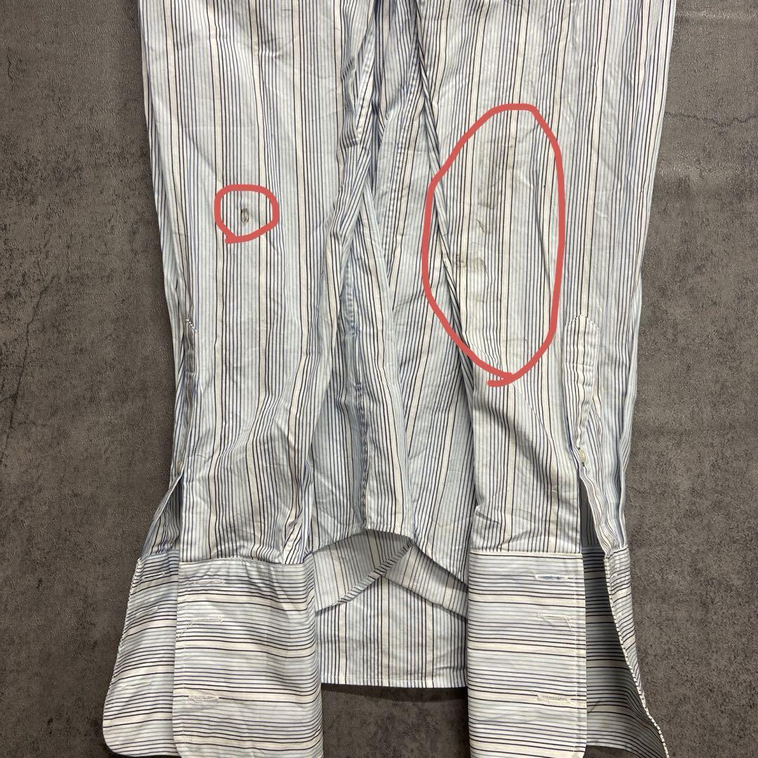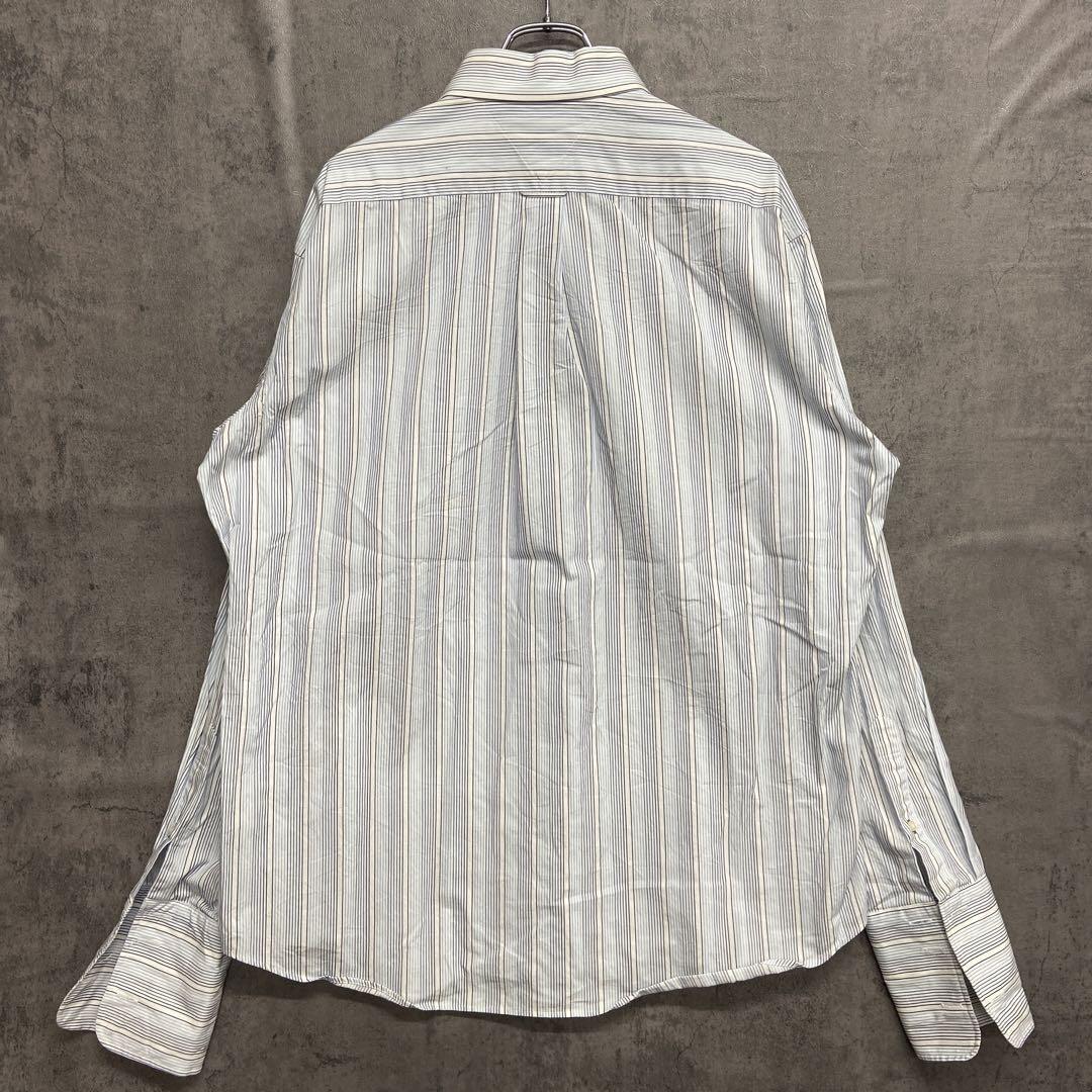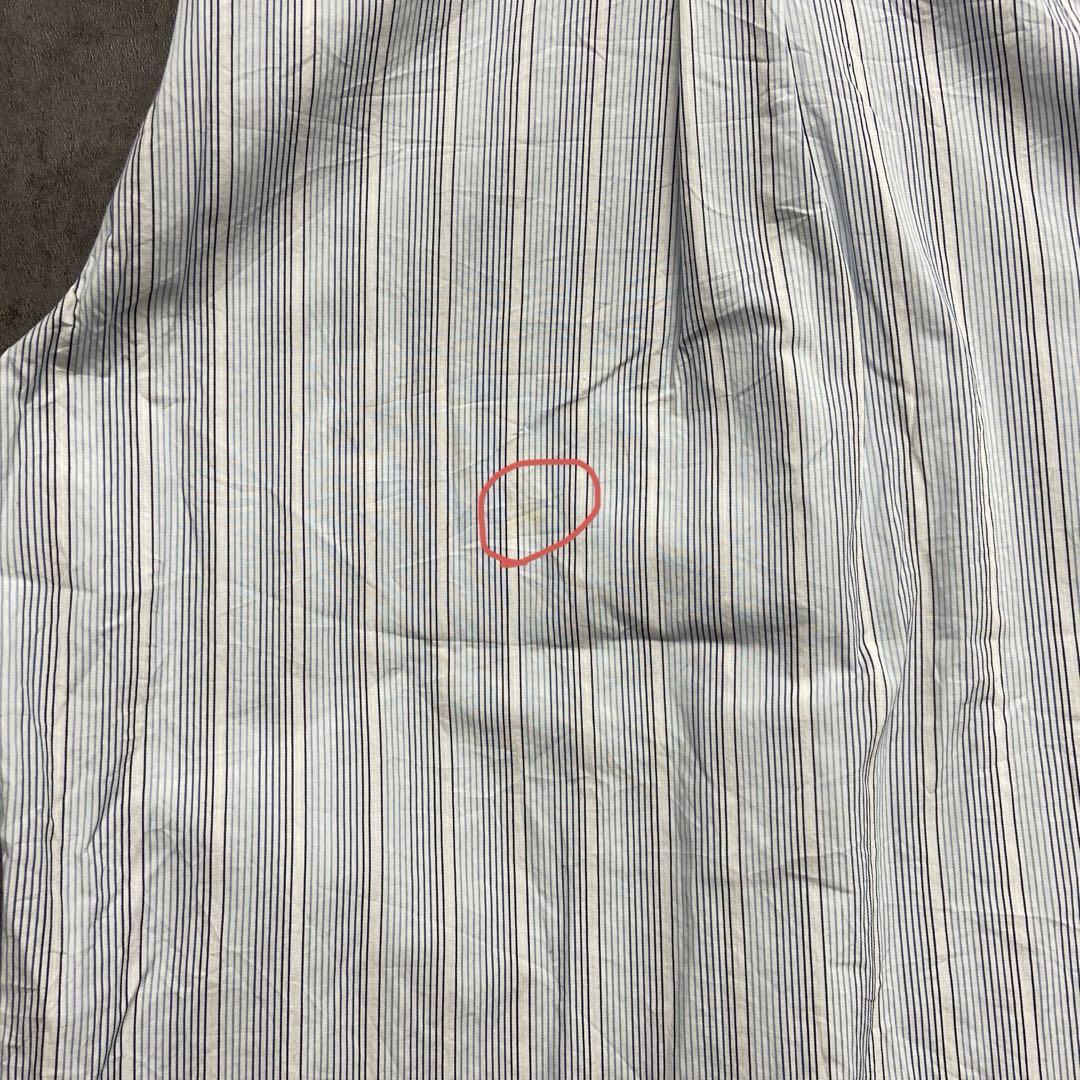 爽やかな白地にブルー系ストライプが映えるトミーヒルフィガーの長袖シャツです。袖口や脇部分にシミが見られますが、人気ブランドのUSA古着です。