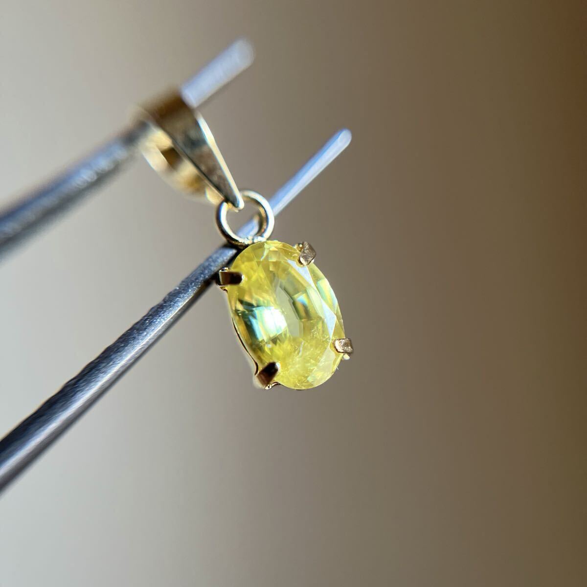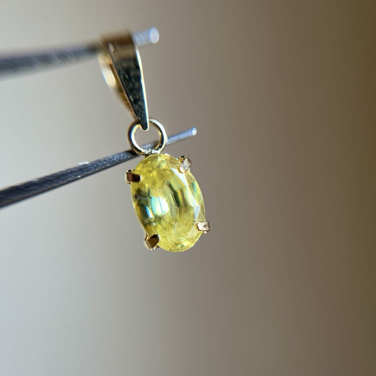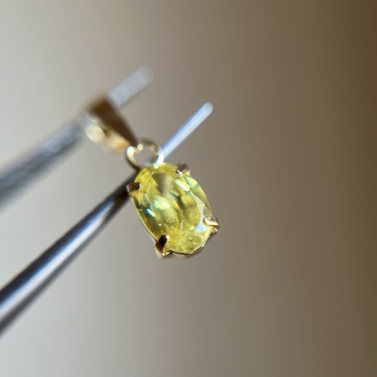 鮮やかな輝きと虹色のファイアが特徴の天然石スフェーンを使用した、オーバルカットのペンダントトップです。