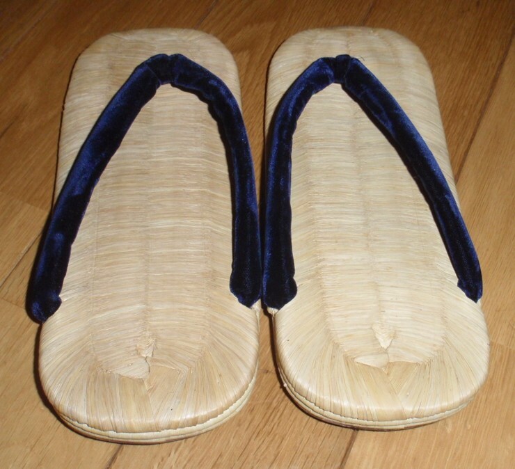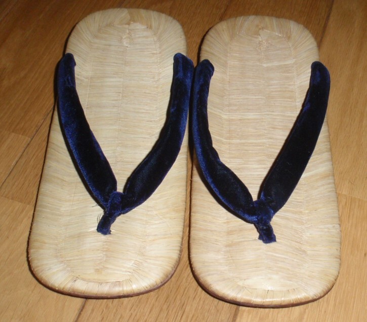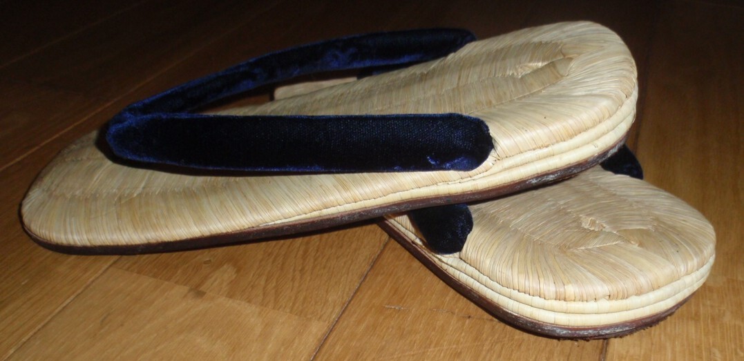 表は細かな編みの本畳表で、鼻緒は本天ビロードの濃紺色、底面は踵3枚重ね、赤牛革底、踵プロテクター付きの丈夫な作りです。