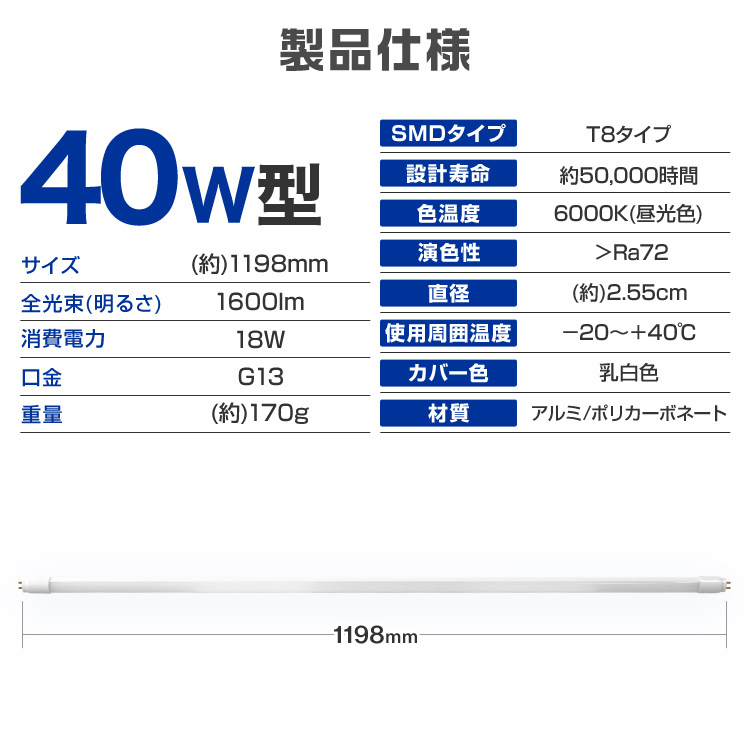 安心の1年保証付き! 高性能高輝度LED(SMD)を使用!驚異的な明るさを実現! 40W形 直管LED蛍光灯です。 工事無しで簡単取り付け可能! 今までネックになっていた配線工事を必要としないタイプです。 ◇当店のLED蛍光灯の特徴◇ 従来の蛍光灯と比べて、長寿命で約5倍長持ち。 低消費電力、省エネで電気料金を大幅削減。 放熱部はアルミニウム合金製で、放熱性が更に向上、軽量化。 本体部はポリカーボネート樹脂+合金製で、割落・飛散しにくい。 (ポリカーボネートは、防弾ガラスに採用されている強度の高い素材です。) 美しい昼光色でお部屋を明るく照らします! 【商品仕様】 直管LED蛍光灯 40W形 ×1 サイズ:全長(約):1198mm 直径(約):25.5mm 全光束(明るさ):1600lm 消費電力:18W 口金:G13 重量:(約):170g SMDタイプ:T8 設計寿命:(約):50,000時間 ※LED商品は一般的に長寿命とされておりますが、使用環境により異なる場合がございます。 色温度:6000K(昼光色) 演色性:>Ra72 使用周囲温度:-20~+40℃ カバー色:乳白色 材質:アルミ/ポリカーボネート 保証期間:7日間 ※商品到着後7日以内の初期不良・破損のみご対応させていただきます。 【注意事項】 ・グロースターター方式の器具は、グロー点灯管を取り外すだけで、そのままご使用できます。 ・一般蛍光管と交換するだけでご使用できます。ただし、ひとつの灯具に一般蛍光管や他のLED蛍光灯と混ぜて使用しないでください。 ・ラピッドスタート方式、インバーター方式、電子安定器、調光できる安定器を持つ灯具、他社LED蛍光灯などのために配線加工や改造をされた灯具は使用できません。 また取り付けないで下さい。 無理に使用を続けると、動作異常となったり、灯具や本製品が故障することがあり、まれに発煙、発火に至るおそれがあります。 |