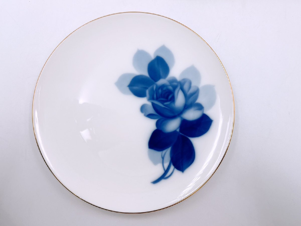 詳細:青い花(バラ)がエアブラシのような柔らかな農淡で描かれている上品なお皿1枚です。