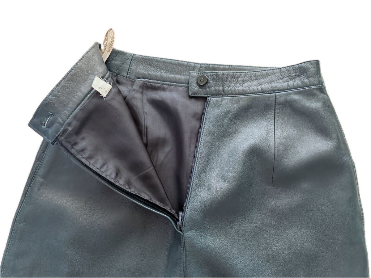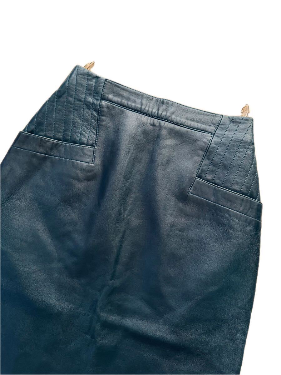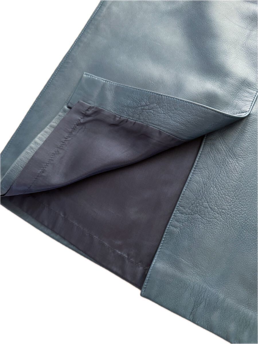 ・しっとり柔らかな上質レザー(本革:羊革かと)を使い立体的なウエスト、ヒップから裾に向かってスッと伸びたモダンなシルエットにポケットのカットやステッチデザインがとてもお洒落なスカートです♪
