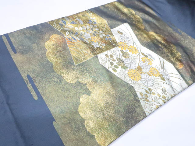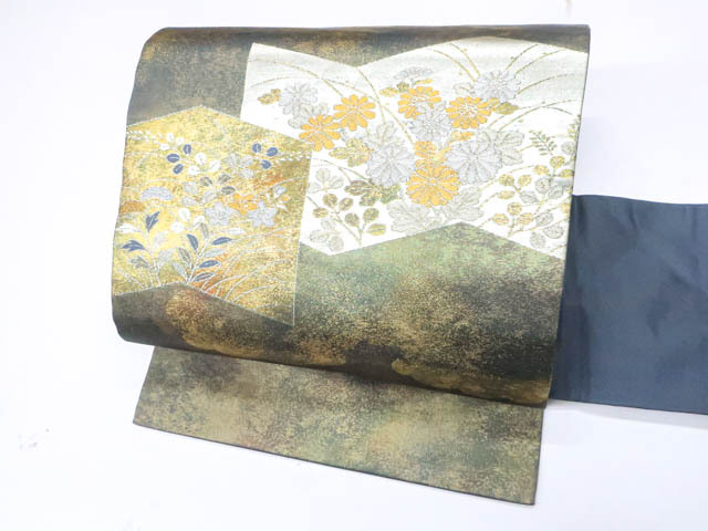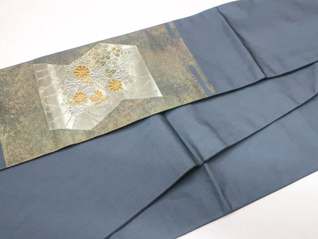 リサイクル商品でございますので太鼓下部に点しみがございますがご使用いただけるかと存じます。 地色は 鼠です。 1枚目の画像が近いお色かと思われます。 素材は正絹です。 |