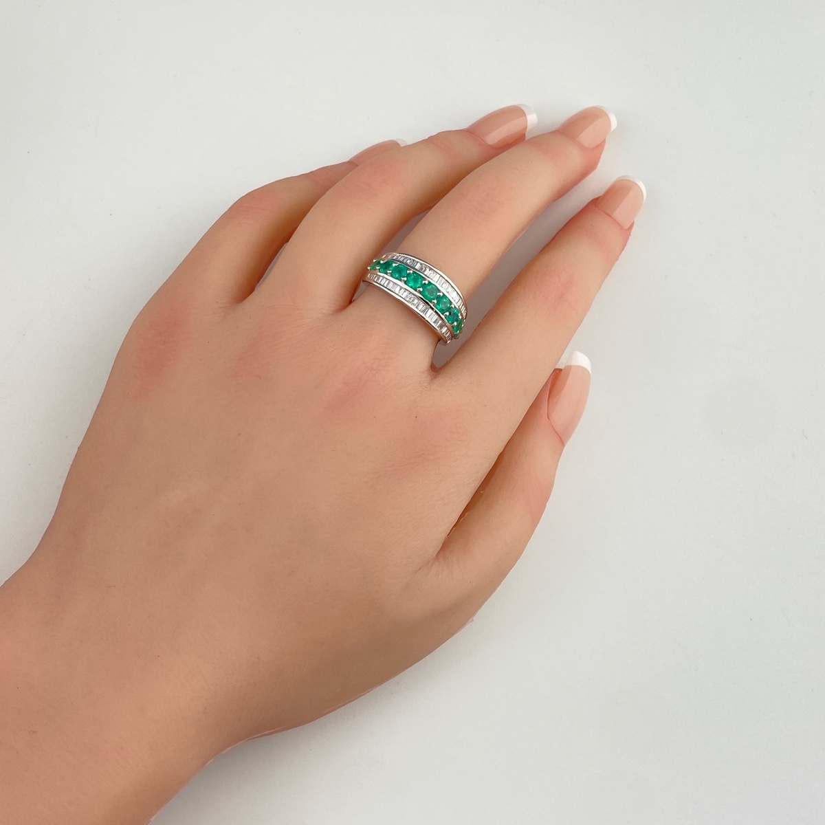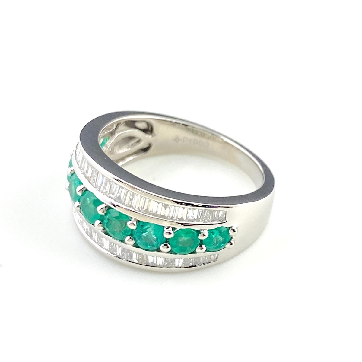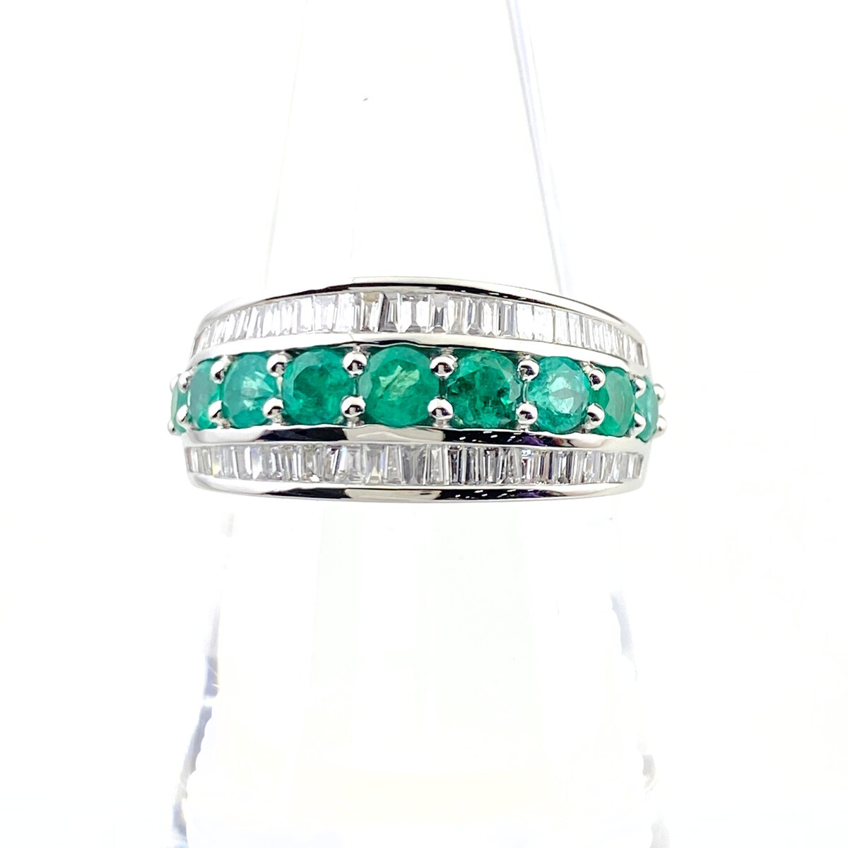 実寸サイズ| 約15号 | リング最大幅 | 約9.8mm | リング最小幅 | 約2.7mm | リング厚さ | 約3.8mm | 素材 | Pt950、エメラルド、ダイヤモンド | コメント | エメラルド:1.00ct、メレダイヤ:0.55ct | 中古品の為、若干のキズや汚れがございます。 付属品 | なし | |