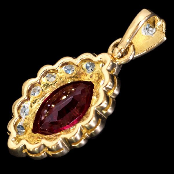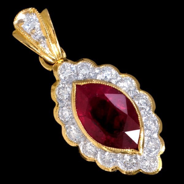 燃えるような深紅の大粒ルビー。マーキスカットが施されたその石は、まるで生きているかのように、薄暗い金庫室の光を吸い込んで、内側から妖艶な炎を放っている。その周囲を取り巻くのは、眩いばかりのダイヤモンド。スカラップ状の縁取りが、クラシカルで優雅な印象を与える。地金は、温かみのある18金無垢。そして、バチカン(チェーンを通す部分)にまで、緻密な細工とダイヤモンドが施されている。