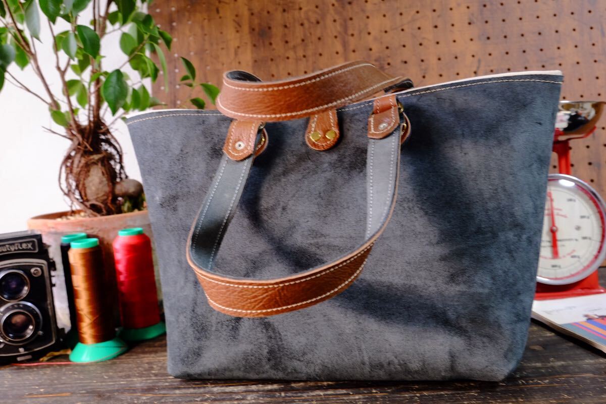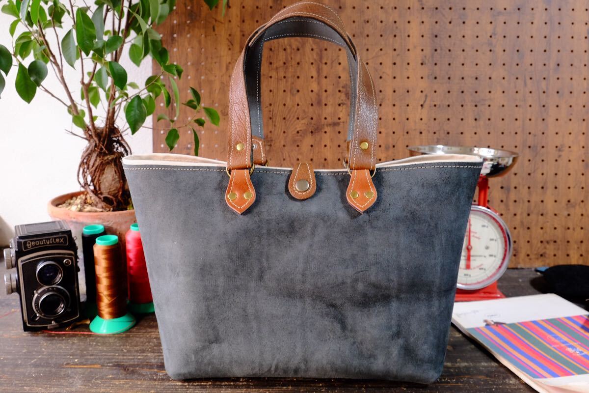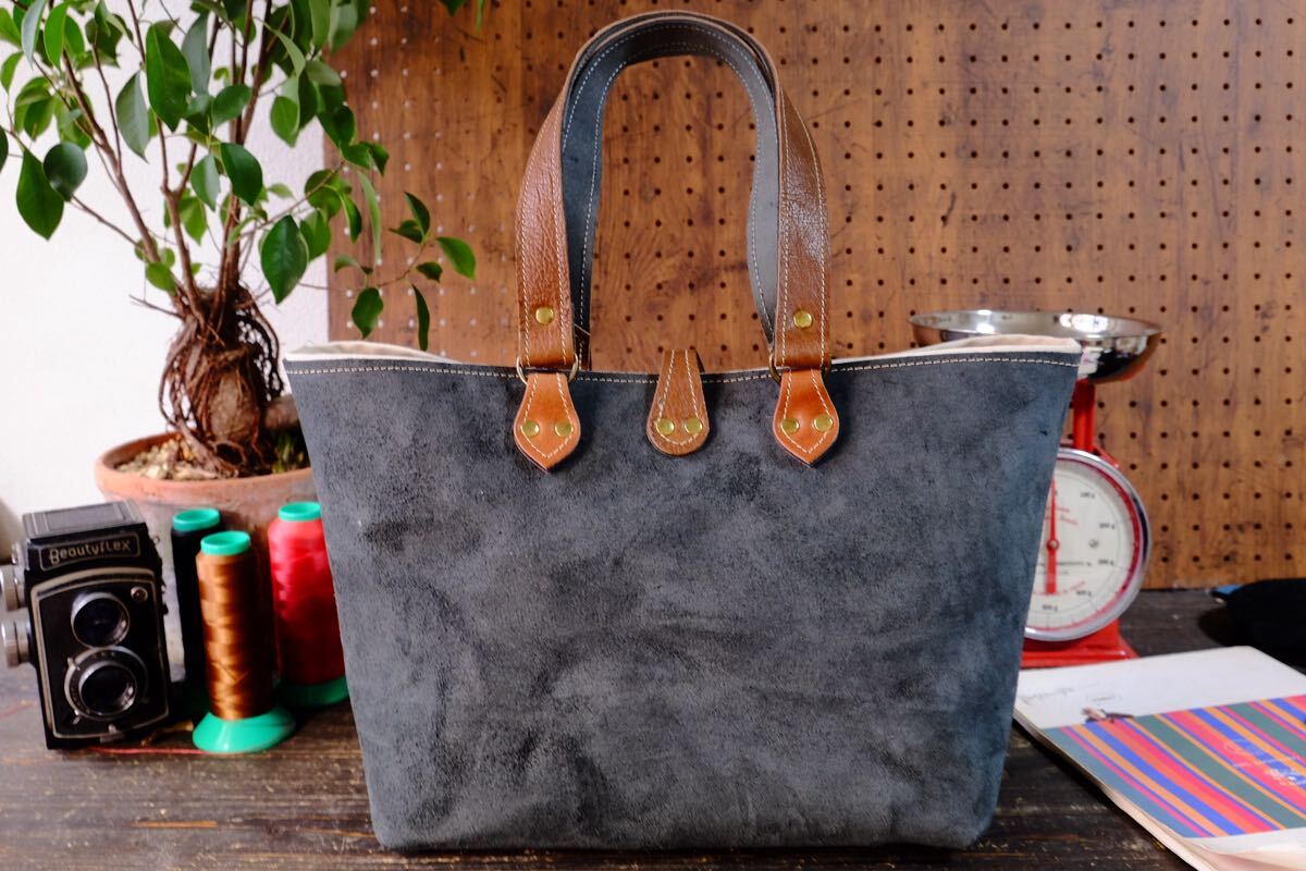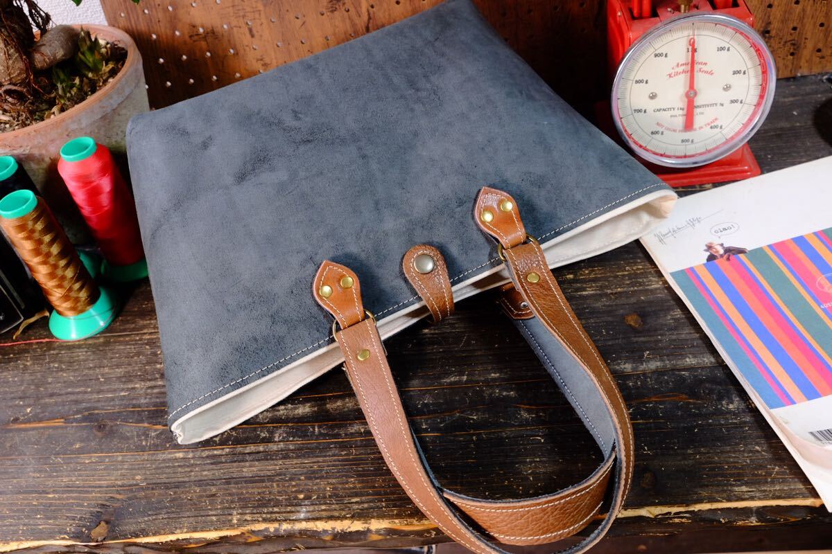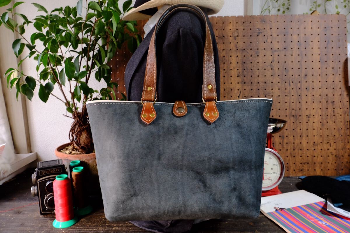 ◆イタリア産霜降りブッテロヌメ牛革レザートートバッグ Lサイズ 作家手作り★床革グレイブラウン日本製帆布鞄ハンドメイドメンズA4