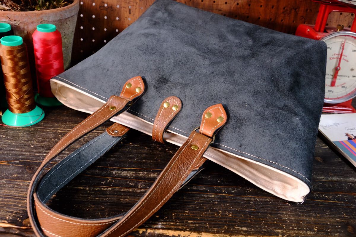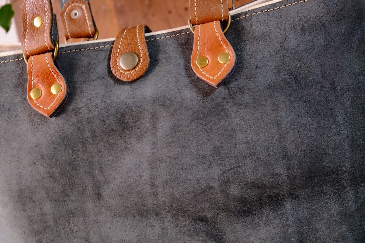 大変芳醇なイタリアン牛革のブッテロレザー床革ダークグレイの肩部位とブラウンコンビヌメを中心に使用しクラシカルなデザインに仕立てました。裏地は丈夫な布でお創りしておりますので、耐久性とバッグとしての総合的な軽さを可能にしております。筋繊維が特徴のスエード風レザーで容量も多くの物が入り大変扱いやすいバッグです。