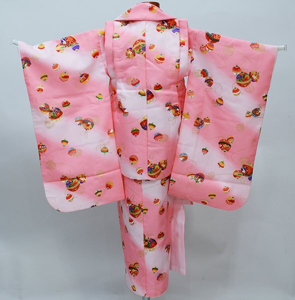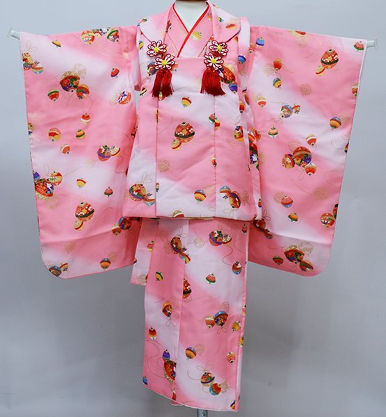 サイズ | ■着物 ・被布丈約48cm ・裄丈約40cm(3.5cmの上げ、7cmのばすことが可能) ・袖丈約57cm ・着物丈約93cm ■草履18cm(フリーサイズ) 適合身長83cm~105cm ※着丈=背中首のゴリゴリ部分から、足くるぶしまでの長さ ※裄丈=腕を斜め45度下げた状態で、背中首ゴリゴリ部分から、肩上を通して、手くるぶしまでの長さ ※身長87cm~96cmであれば特に直さずともこのままでご着用いただけるかと思います ※はじめから肩上げがとられているので解いて数センチ伸ばす(丈出し)ことも可能です。 ※腰上げはとられていないため腰ひもで着付け補正をいただければと思います。 |