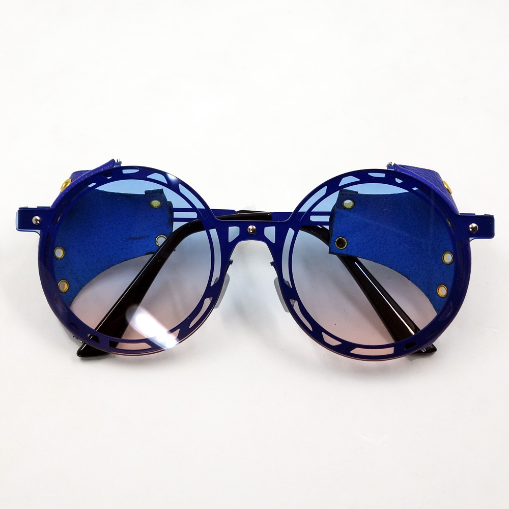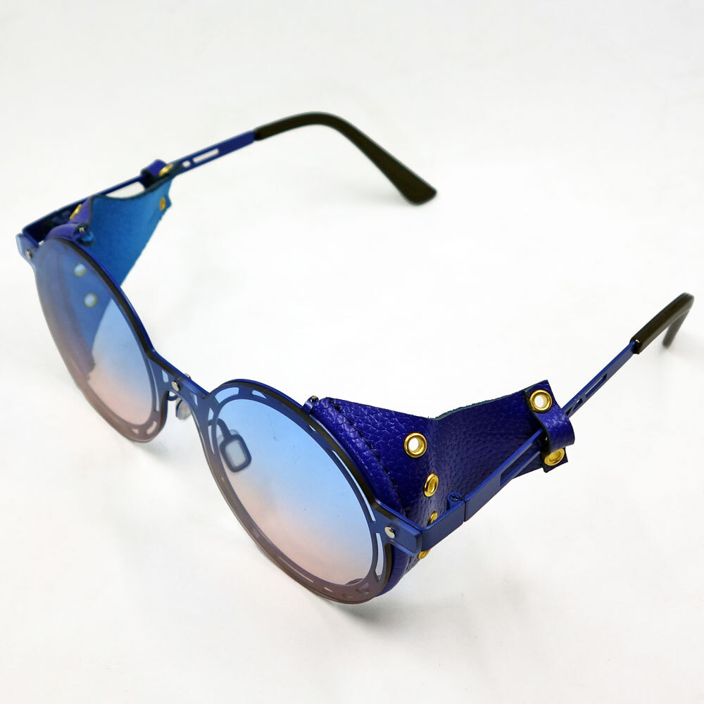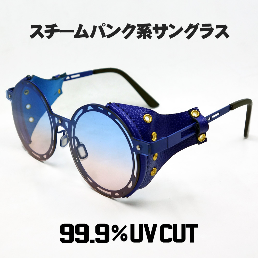 スチームパンク風 サングラス メンズ レディース 風防 丸目 ラウンド型 メタル ブルー 青