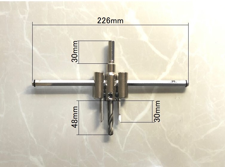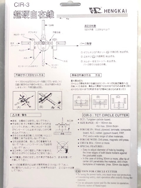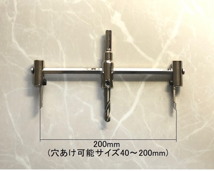 穴あけサイズ40~200mm好きなサイズの円形に穴あけ可能です。※裏面記載は180㎜とあるが200mmにセットできます