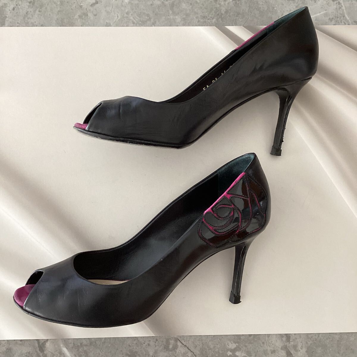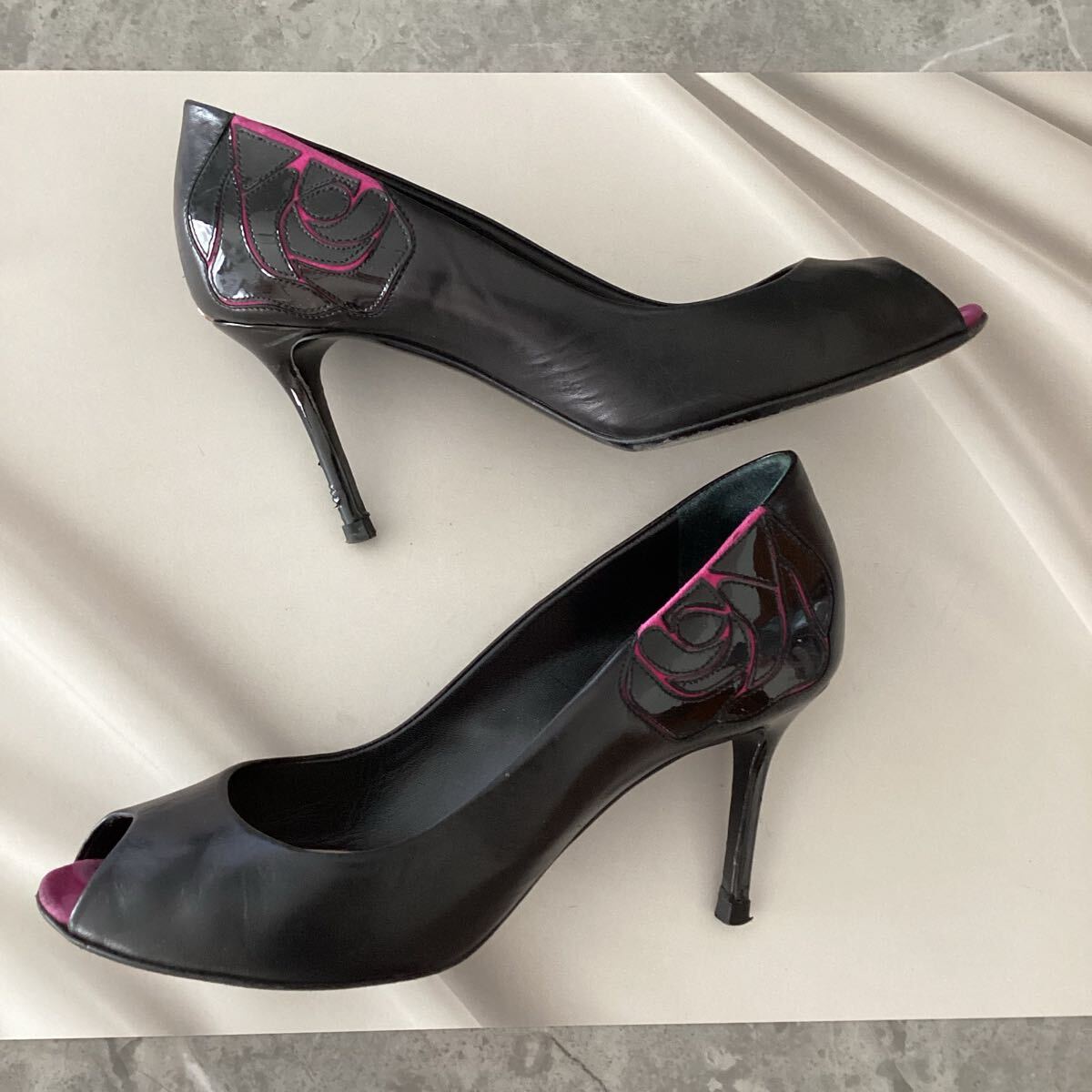 オープントゥデザインの黒いハイヒール、エナメルのローズが特徴。