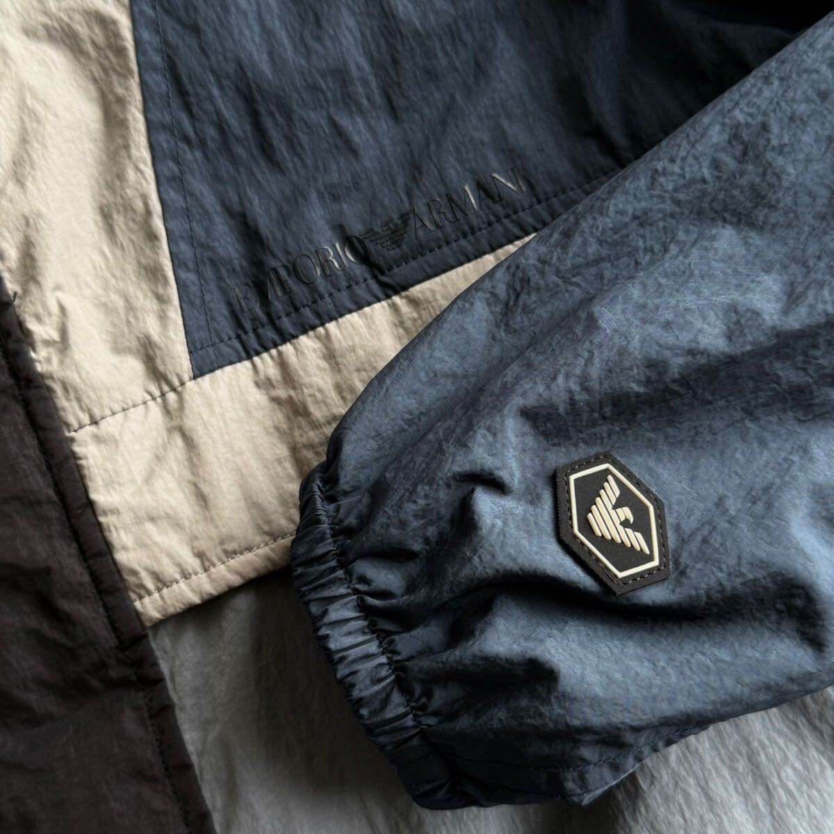 片面はミニマルでダークトーンでスマートに、もう一方はグレイ×ネイビー×ブラックの大胆な切り替えデザインで存在感抜群。気分やシーンに合わせて印象を変えられる2way仕様は、まさにアルマーニらしい遊び心と実用性の融合です。胸元にはさりげなくブランドロゴが施され、袖には立体的なメタルエンブレムが輝きを添えます。