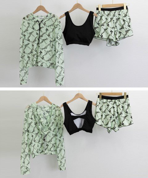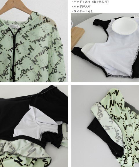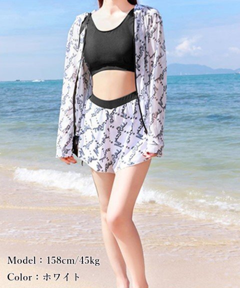 存在感のある英字ロゴがオシャレな、スポブラ+ショートパンツ+長袖ラッシュガードの水着3点セット