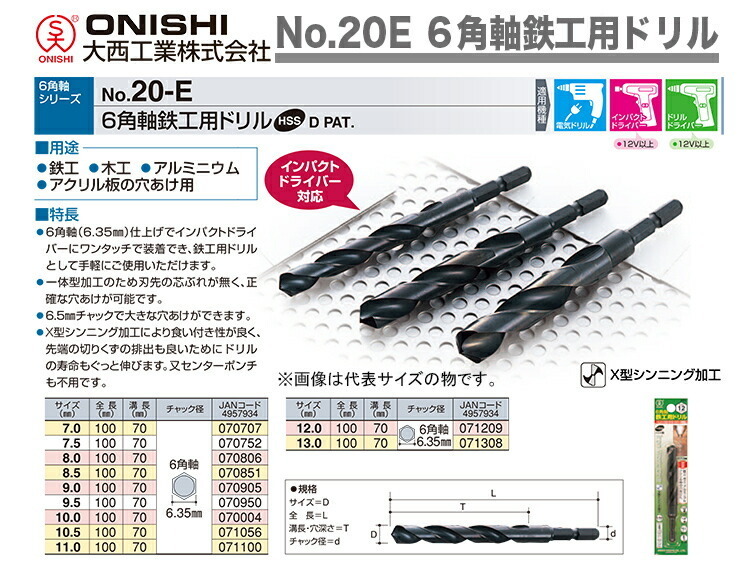 ONISH/大西工業 No.20E 6角軸鉄工用ドリル 7.5mm