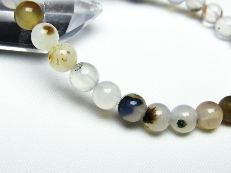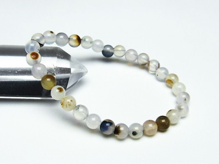 ■商品名: デンドリック アゲート ブレスレット ■商品ID: T108-5592 ■商品重量:約 9.9g ■商品サイズ:内周約:156mm(±5mm)粒直径約:6mm(±0.5mm) 【アゲート(瑪瑙)】 和名では瑪瑙(めのう)といい、アゲートの模様が馬の脳のように見える事からこのような名前が付けられました。 アゲートは赤、緑、青、黄、黒など、様々な色に着色されることで石本来のパワーがさらにアップするといわれており、着色により魅力を増す天然石はアゲートだけとも言えます。 さらにはアゲートを組み合わせるとペアになっているペアアゲート(トレジャーメノウ)は龍穴を生み出すとされ、風水的にも良いといわれています。 アゲートは古来より日本やインドやチベットなどで魔よけやお守りとされてきました。 失敗や不幸を遠ざけ金運や仕事運、成功運とも結び付けてくれる効果のほか、安産のお守りにも良いとされています。 さらに家庭円満や対人関係をスムーズにするなど、オールマイティな効果を持った石です。 ⇒ アゲートをもっと詳しく ◆ワンポイント情報 アゲートはカルセドニーの変種で、染色がされていなくともそれぞれの種類に多様な色があります。 ざっと仲間を挙げてみてもオニキス(黒)、サードニクス(橙色)、ブルーアゲート(青)、グリーンアゲート(緑)、イエローアゲート(黄)、ブルーレースアゲート(縞青)、モスアゲート(縞緑)、天眼石(縞黒)、カーネリアン(橙色)、ジャスパー(多様な縞)などとても多くの特徴と色合いを持っています。 |