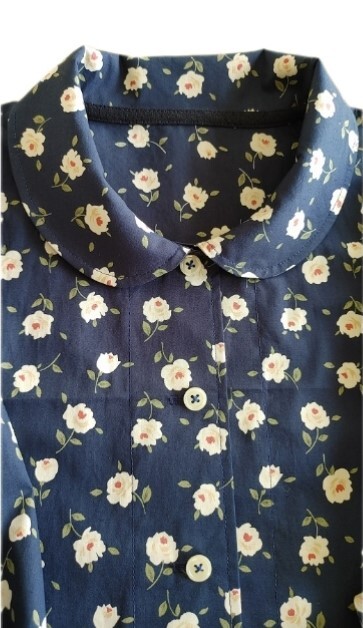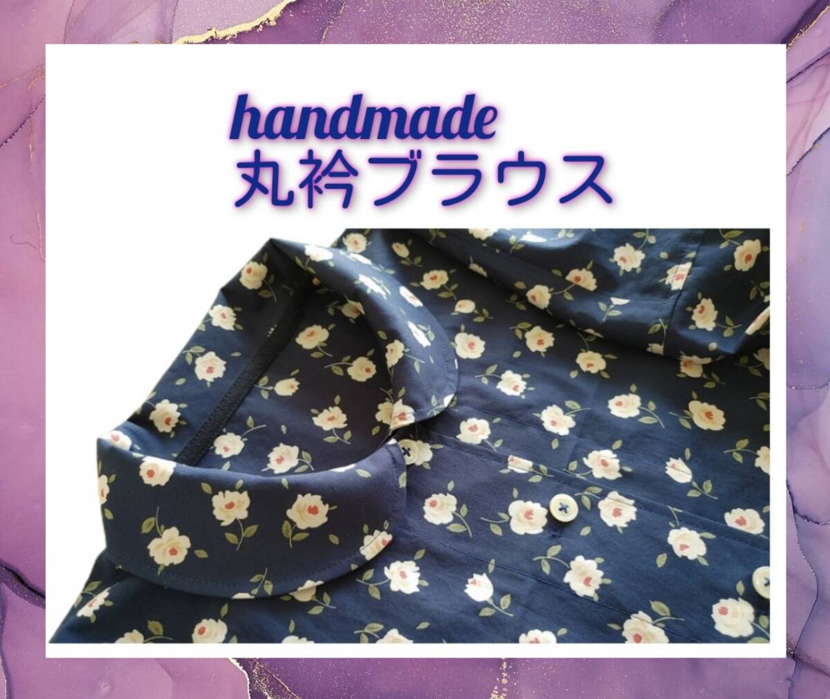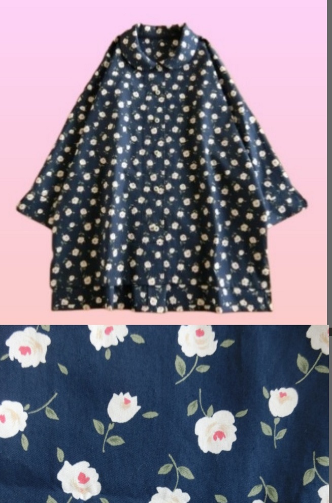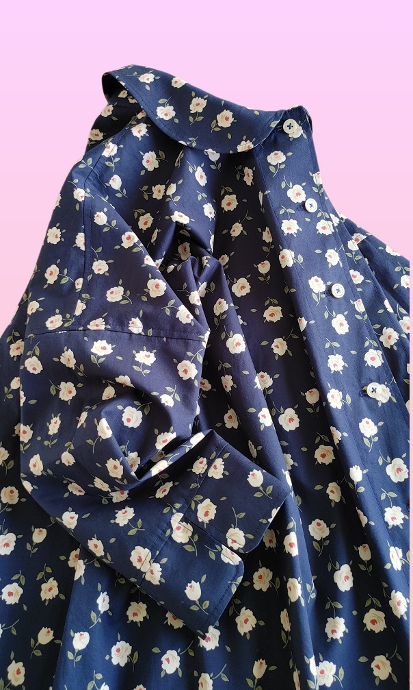 ハンドメイド 紺ベース×小花柄 丸ちび襟 前後差ブラウス フリー 綿100