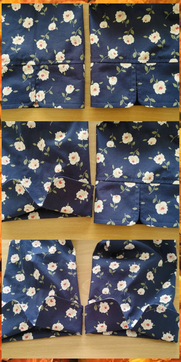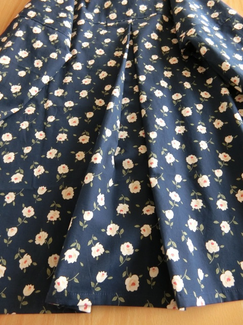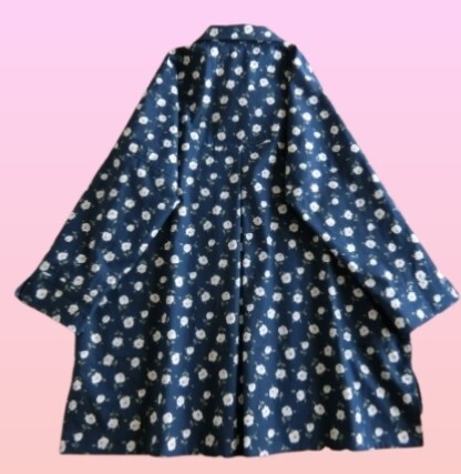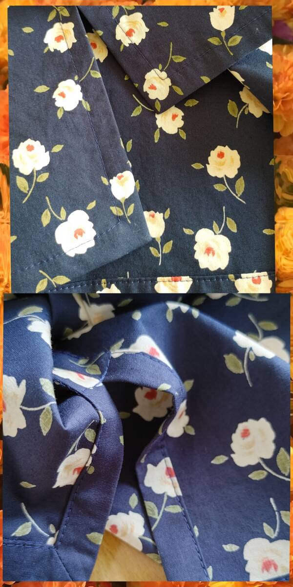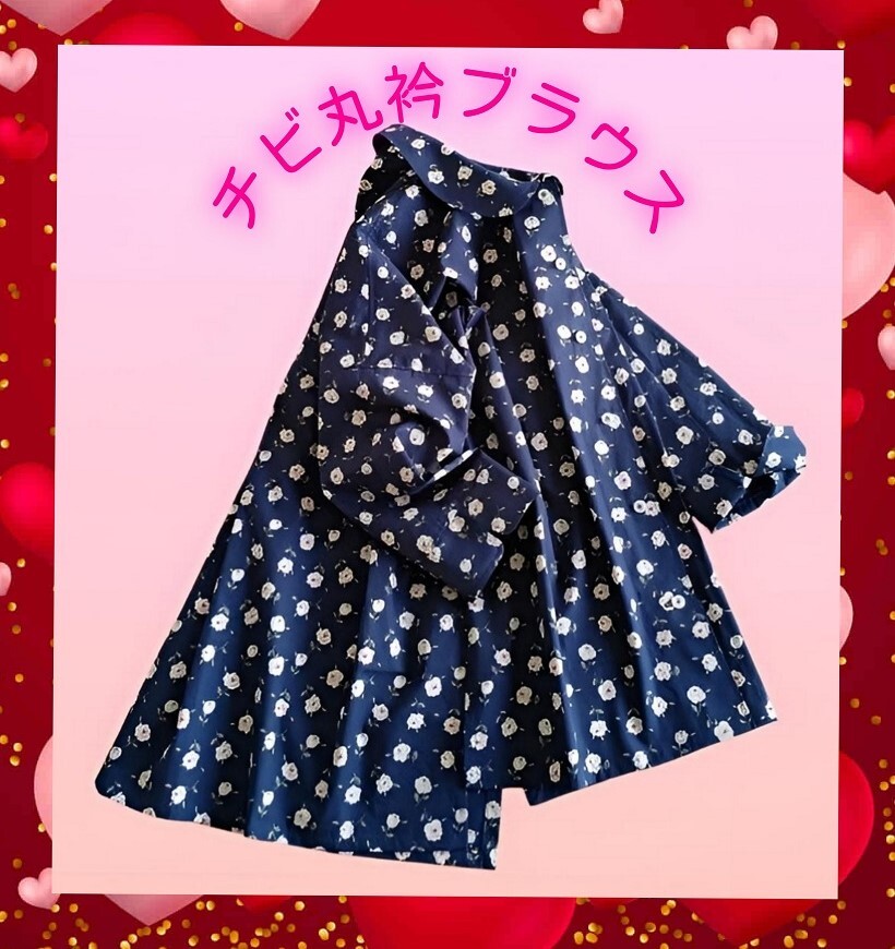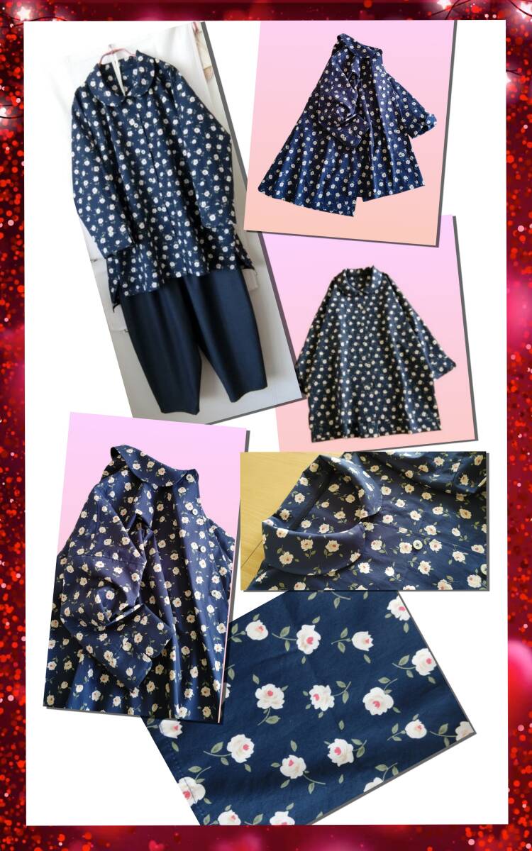 ハンドメイド 紺ベース×小花柄 丸ちび襟 前後差ブラウス フリー 綿100