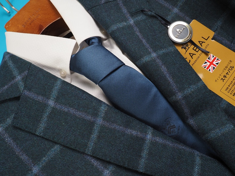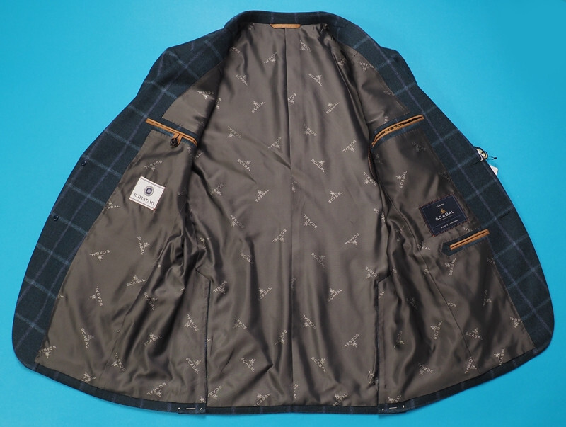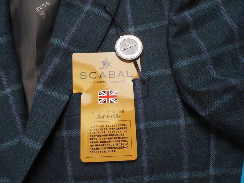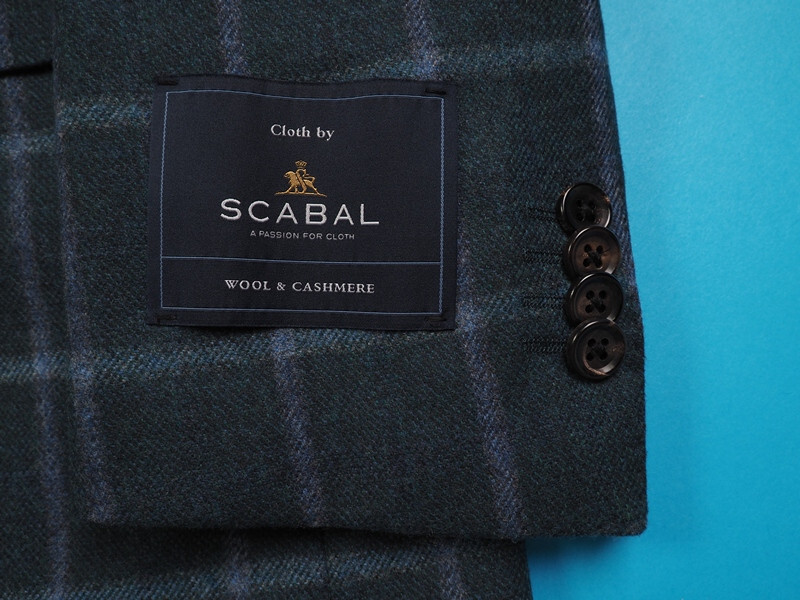 ファブリックは英国製生地の中でも最高峰ランクで、「ビンテージ生地の王者」と言われるスキャバル社のカシミヤ混ウール フランネル生地を使用。職人たちの手作業によって、織り上がった生地にペーパープレス仕上げを施すなど、生地の輝きや着心地の良さを高めるための努力を惜しまないことも、ヴィンテージ生地の王者と呼ばれる所以です。既製品では無く、オーダーメイドに供される最高級ランクの生地になります。その証として内ポケットに生地タグの耳が用いられています。