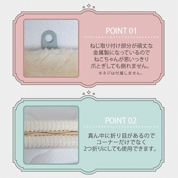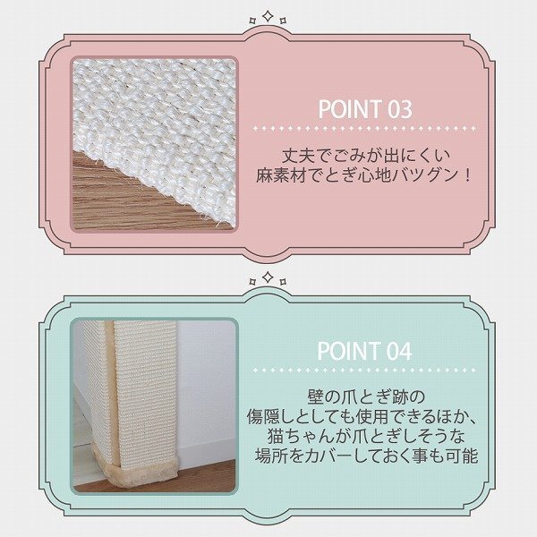 新築、借家の壁や柱を猫の爪とぎ被害から守ってくれます。 本体の真ん中が開いているので、柱だけではなく二つ折りしても使うことができます。 使い方次第で様々な置き方が可能です♪ ■商品仕様 サイズ(約):250×510×25mm 重量(約):1.04g 材質:麻、ポリエステル ■注意事項 ・こちらの商品はお客様組み立てとなります。 ・製品は接着剤や麻の臭いがすることがあります。臭いが気になりましたら、風通しの良いところで陰干ししてください。 ・海外製品で、簡易梱包での輸入のため風防に擦れや多少の小キズなどがある場合がございますが、商品自体には問題ありませんのでご了承下さい。 ・仕様・デザインは改良のため予告なく変更することがあります。 |