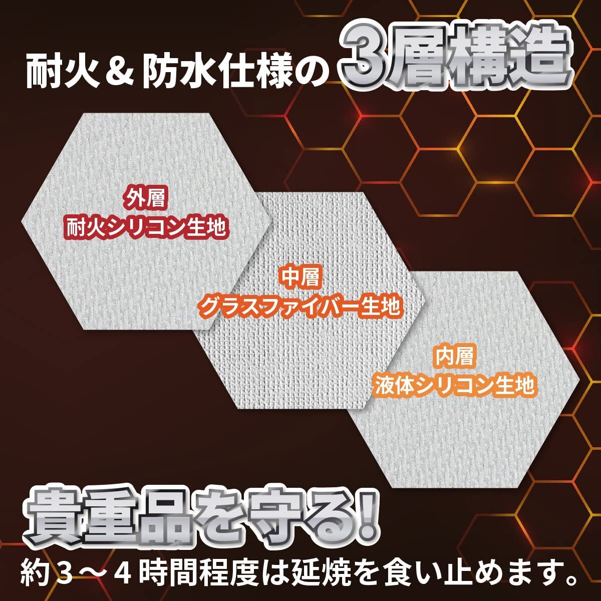 1層に見える耐火バッグの生地は、外装:耐火シリコン>中層:グラスファイバー生地>内層:液体シリコン生地の計3層構造になっています。耐火性に特化しているため約3〜4時間程度は延焼を食い止めることができ、万が一の事態に備えておきたいアイテムです。