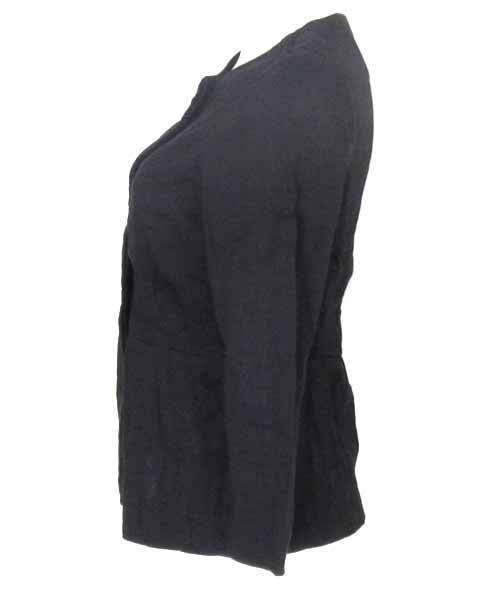 | 大人シックなジャケットの入荷です♪ シンプルな比翼仕立てのノーカラージャケット。 お仕事から行事、デイリーにも使える便利なアイテムです。 リネンブレンドの通気性の良い素材ですので、暑い季節にもおすすめです! 前身頃ウエスト付近、後身頃背中からウエストにかけてアタリのような 薄汚れが見られます。 保管時のシワがございます。 着丈約56cm 袖丈46cm 肩幅31cm バスト約82cm 【サイズ】:(2) 【素 材】:(リネン62%・レーヨン36%・ポリウレタン2%) 【 色 】:(黒) 【程 度】:(AB) **** 12141003-022 388 003 | ||||