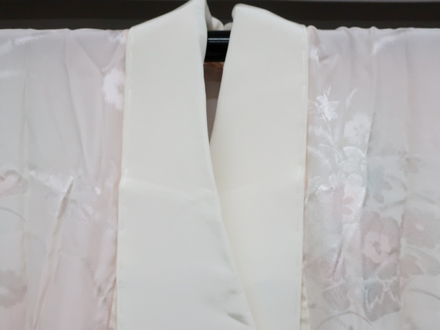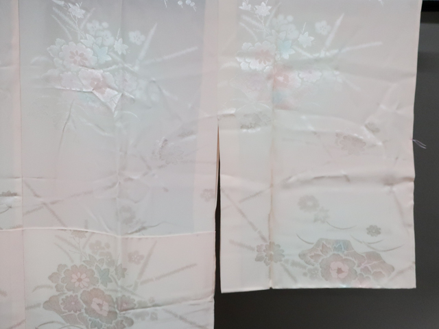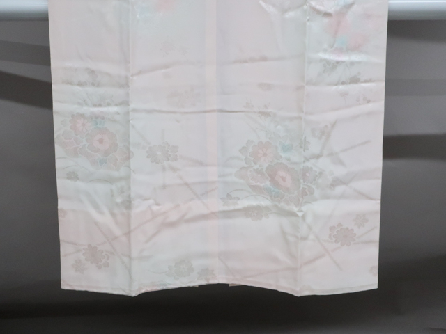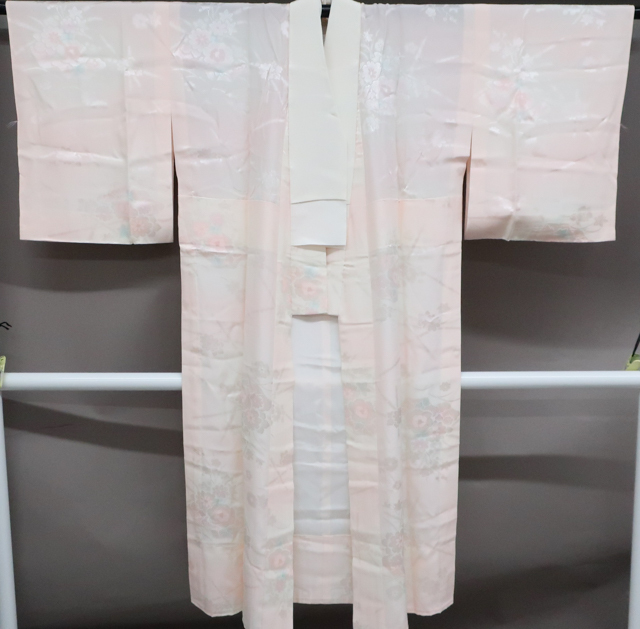 リサイクル商品ではございますが、大変良い状態のお品です。 居敷当て・半衿付きでございます。 地色は、薄ピンク です。 1枚目の画像が近いお色かと思われます。 素材は正絹です。 |
