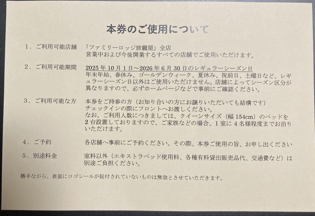 ファミリーロッジ旅籠屋を全国73店舗で展開する旅籠屋の株主優待券1枚です。