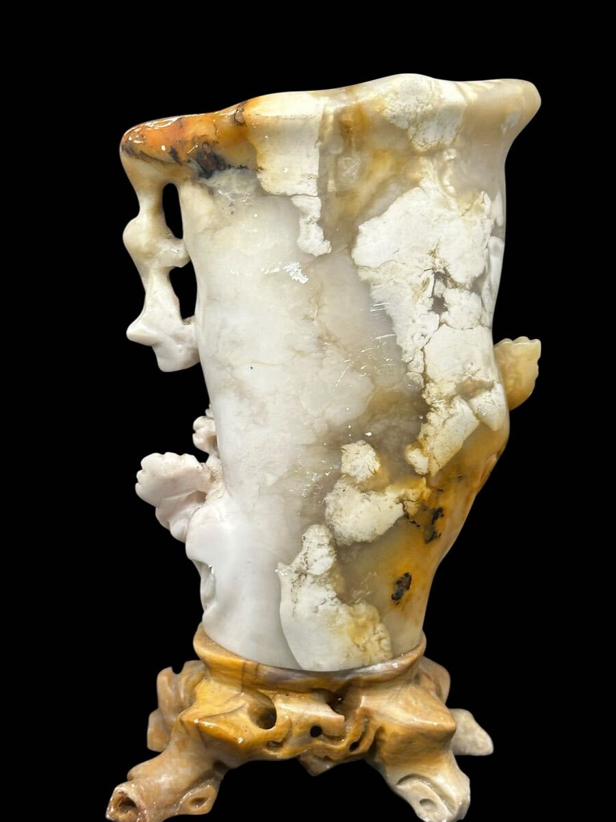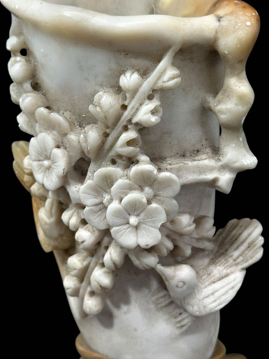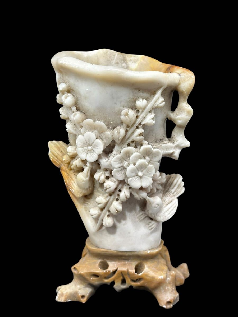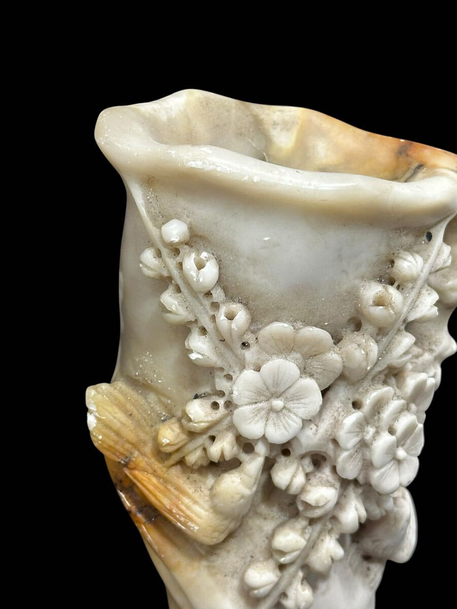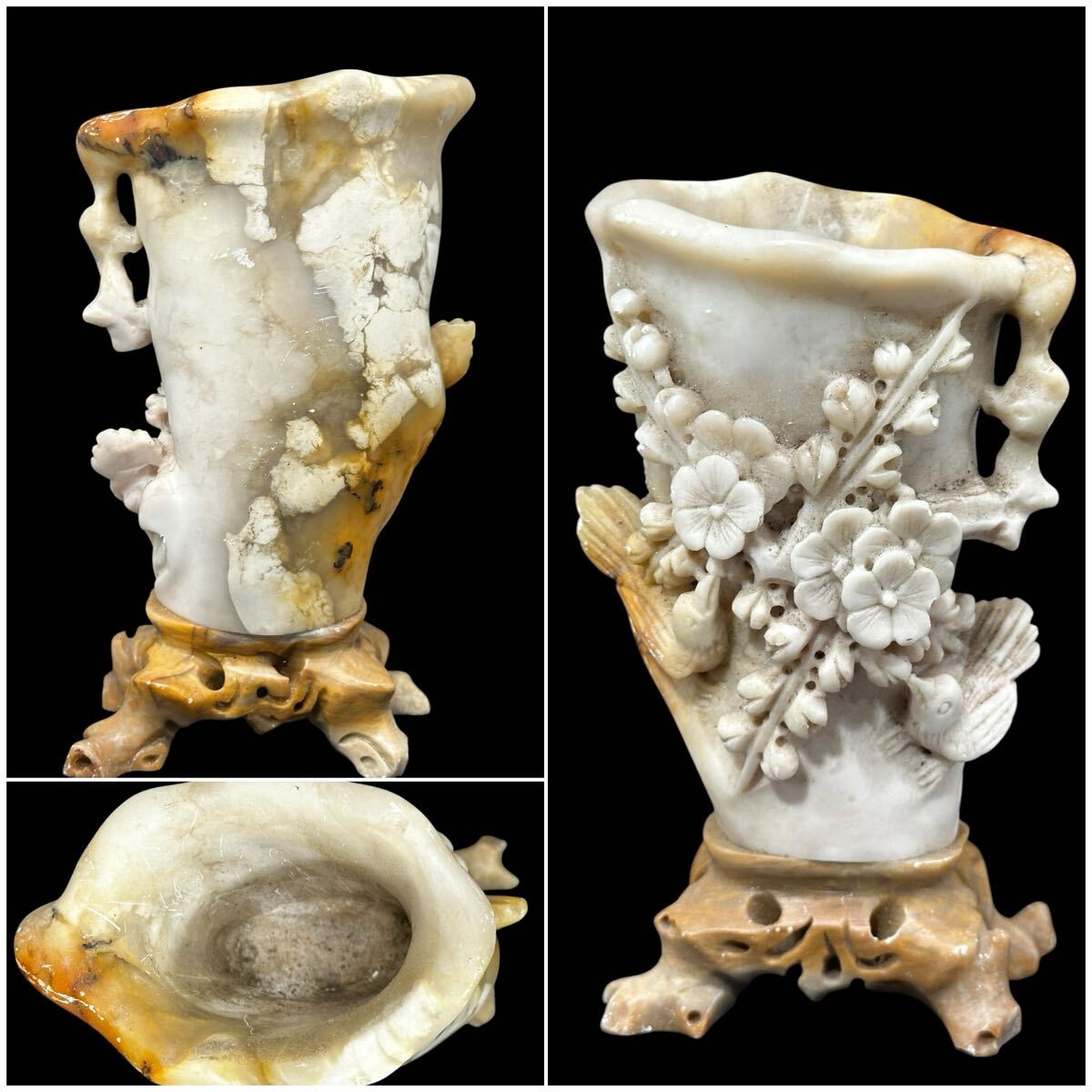 【商品の説明】中国美術 寿山石 石彫工芸 白梅花と鶯図 骨董 美術品 置物 雑貨 装飾品 酒盃 杯 (16.5×9×5cm)
