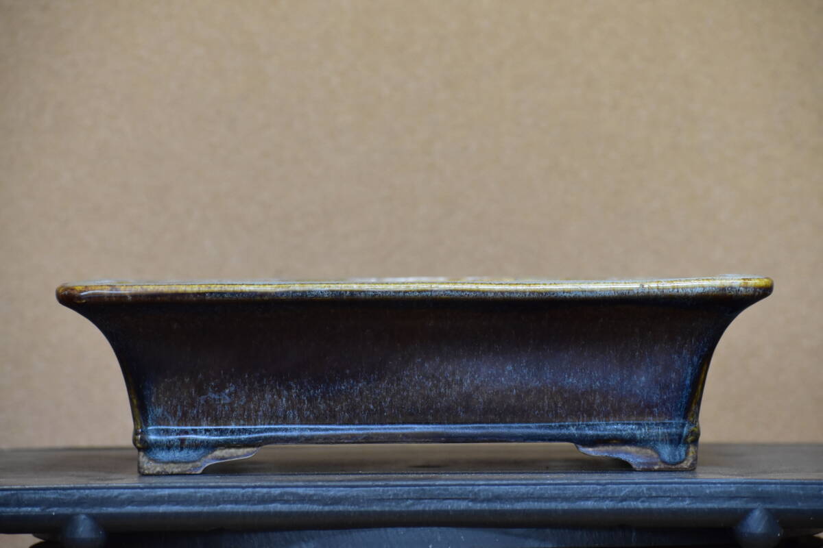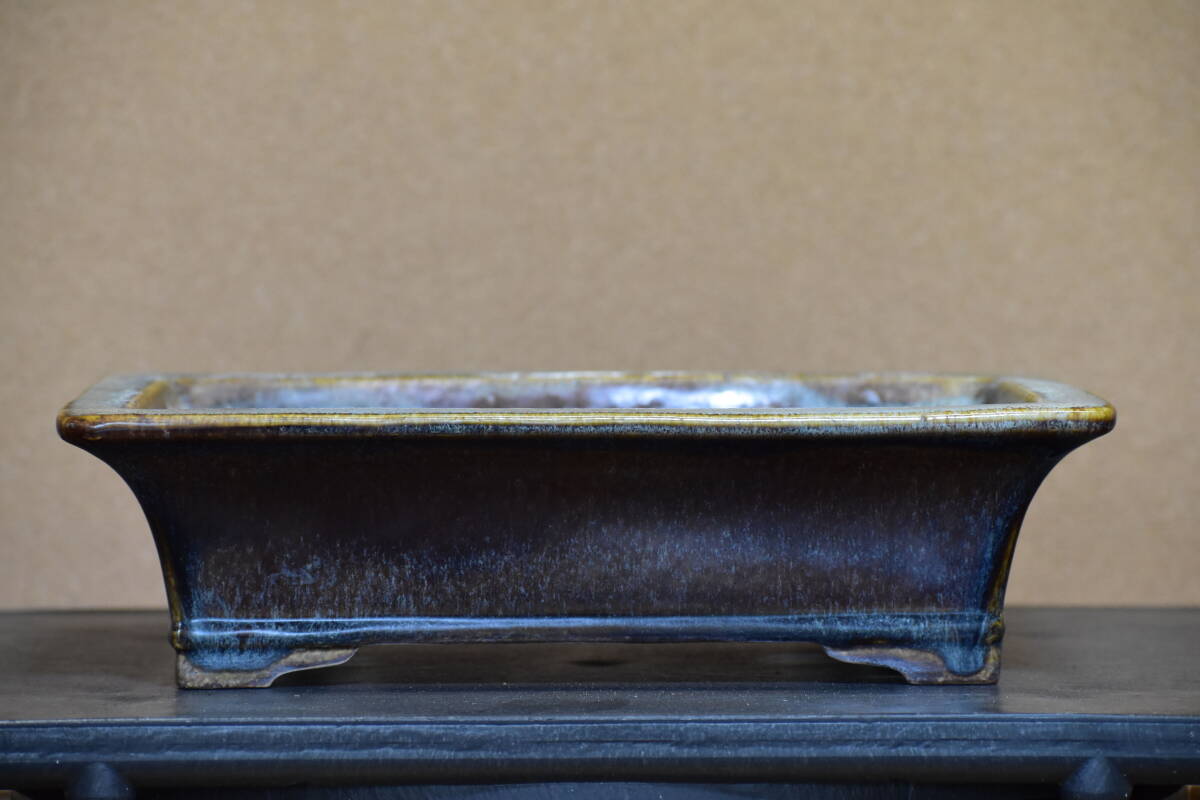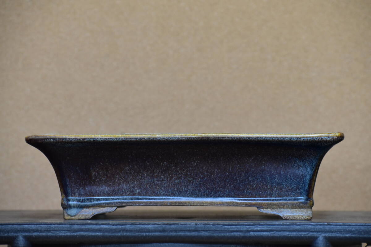 【鴻陽】 美しい海鼠釉の外縁下帯段足長方鉢 間口33.6cm 人気和鉢作家 希少品