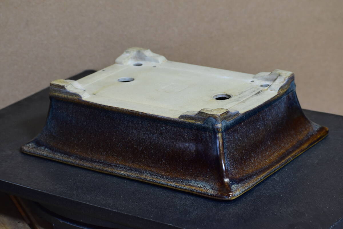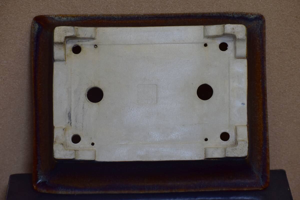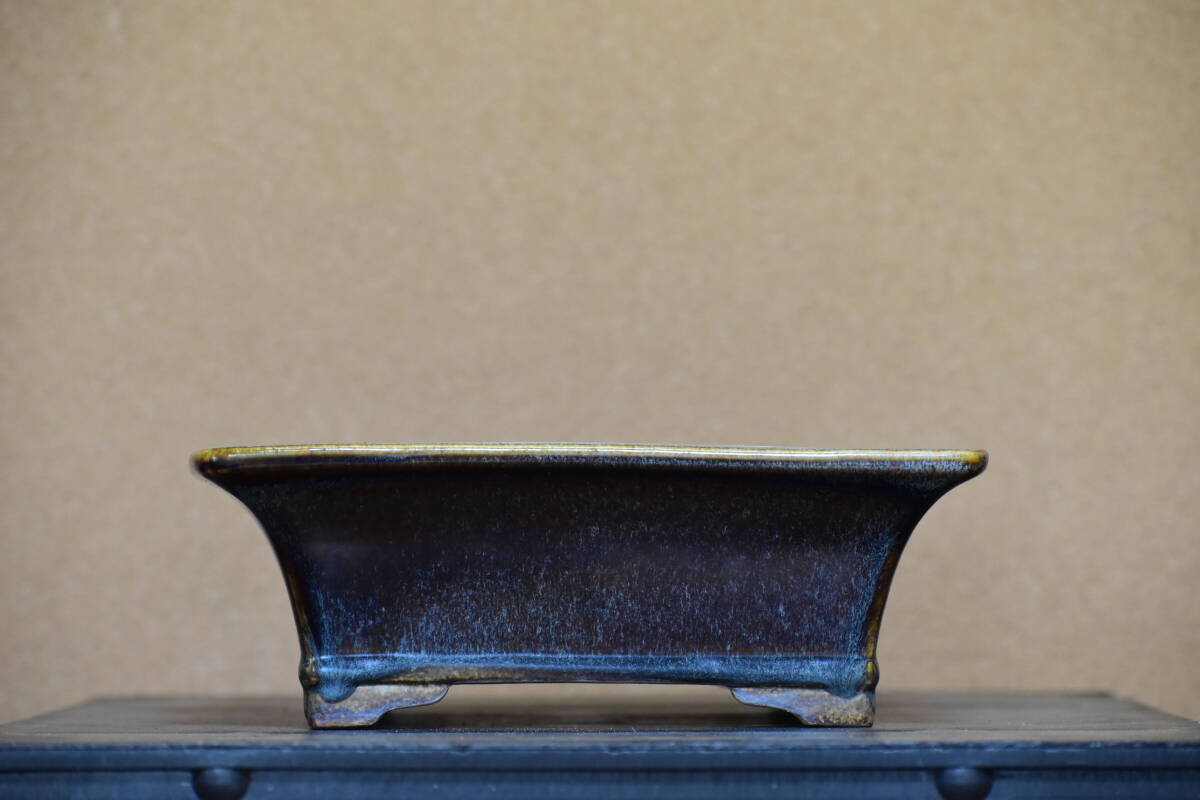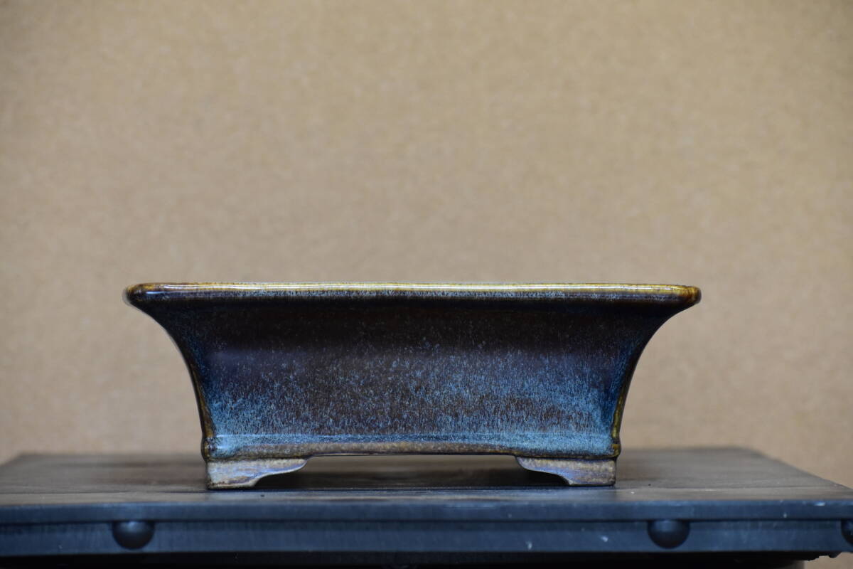 【鴻陽】 美しい海鼠釉の外縁下帯段足長方鉢 間口33.6cm 人気和鉢作家 希少品