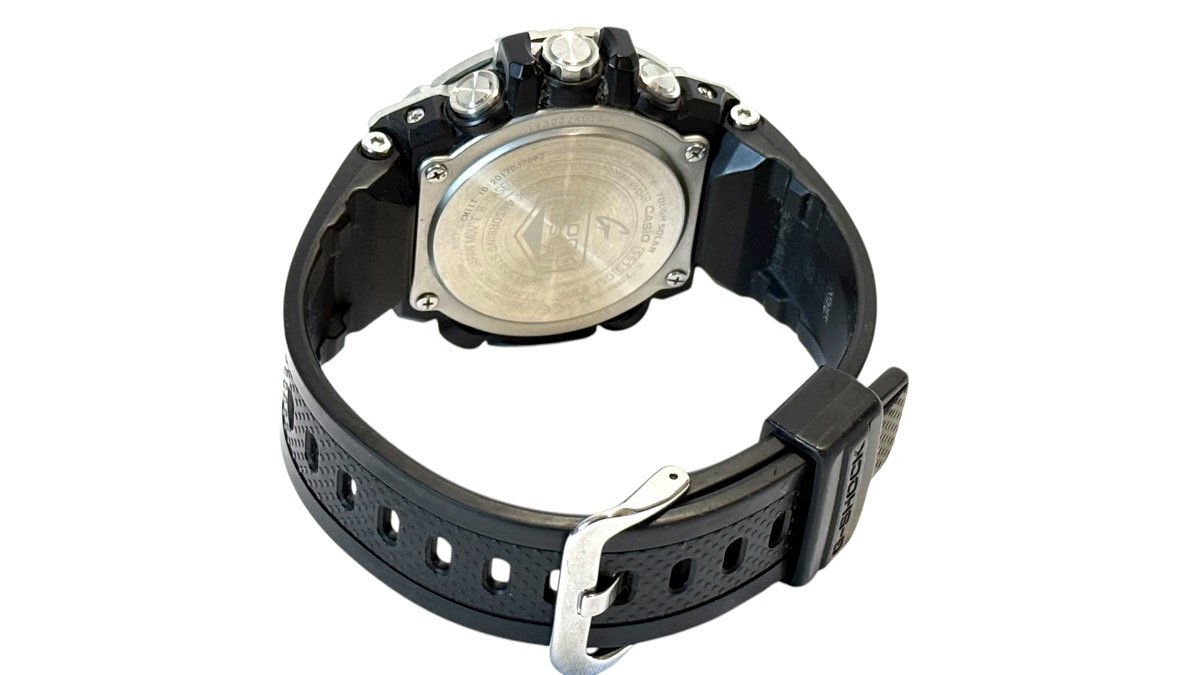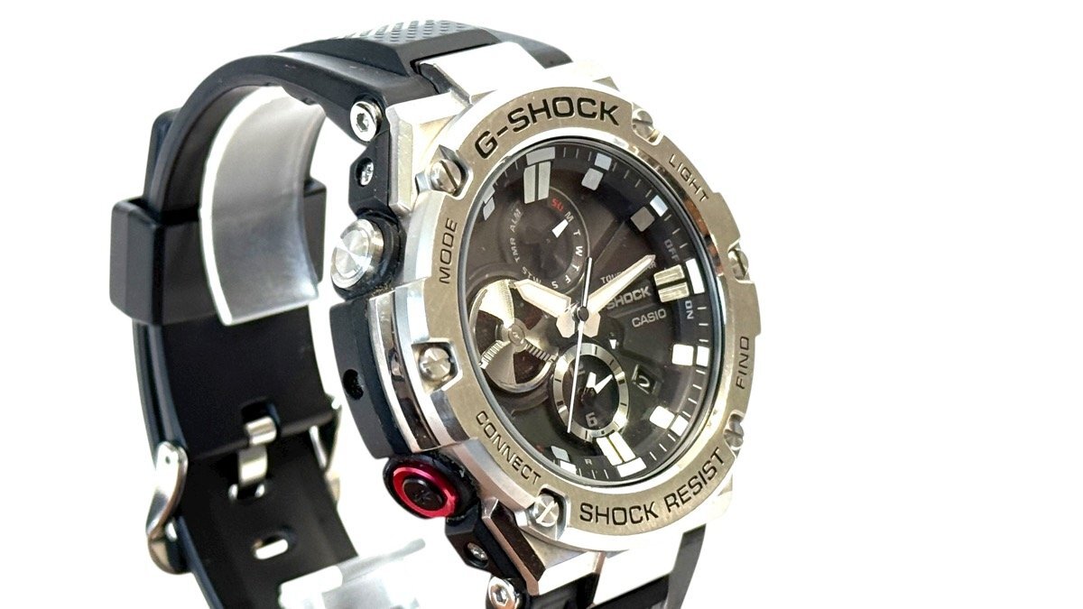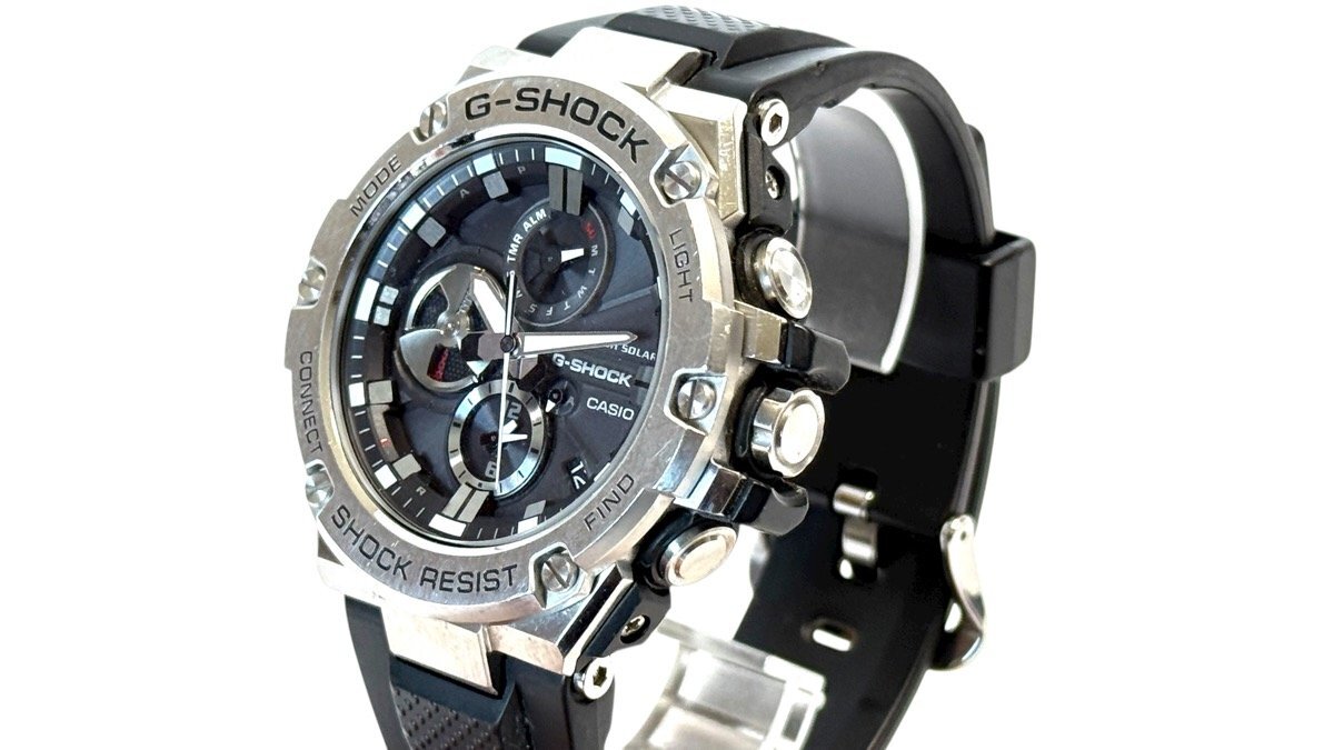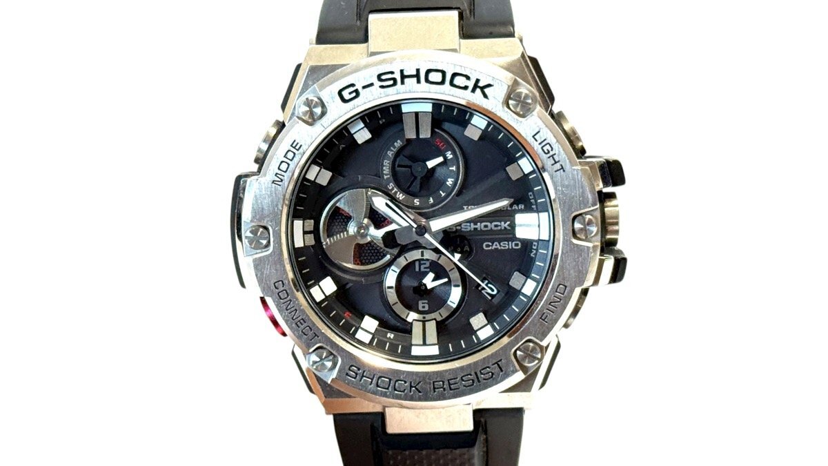 ご覧いただきありがとうございます! 【ブランド】 カシオ 【商品名】 G-SHOCK G-STEEL カシオの腕時計です。9時位置に配したディスク針には、デュアルコイルモーターを採用することで針の動きや機能美を追求。アラームのOn/Off機能やストップウオッチなどの回転表現に加え、バッテリーインジケーターとしての役割を担い、タフな「クロノグラフ」を完成♪ 「レイヤーガード構造」や高密度実装技術によるモジュールの小型・薄型化により、装着性や時計としてのクオリティも高めました。 更に、スマートフォンを介して正確な時刻を取得可能なBluetooth 通信機能を搭載。タフソーラーで安定的な駆動を可能にし、高輝度なLEDライトやデュアルダイアルワールドタイムなど実用的な機能も備えています! 【ムーブメント】 タフソーラー 【サイズ】 公式HPより…58.1 × 53.8 × 14.1 mm 質量101 g 【コンディション】 ランク『S』 補足:擦れ傷がほんのわずかにある程度でとても綺麗な印象のお品です。