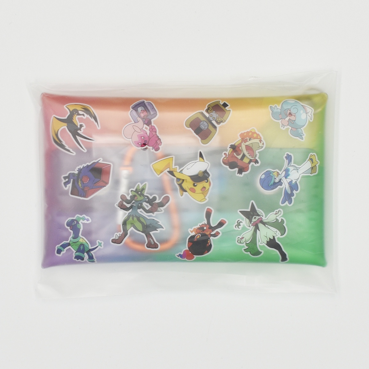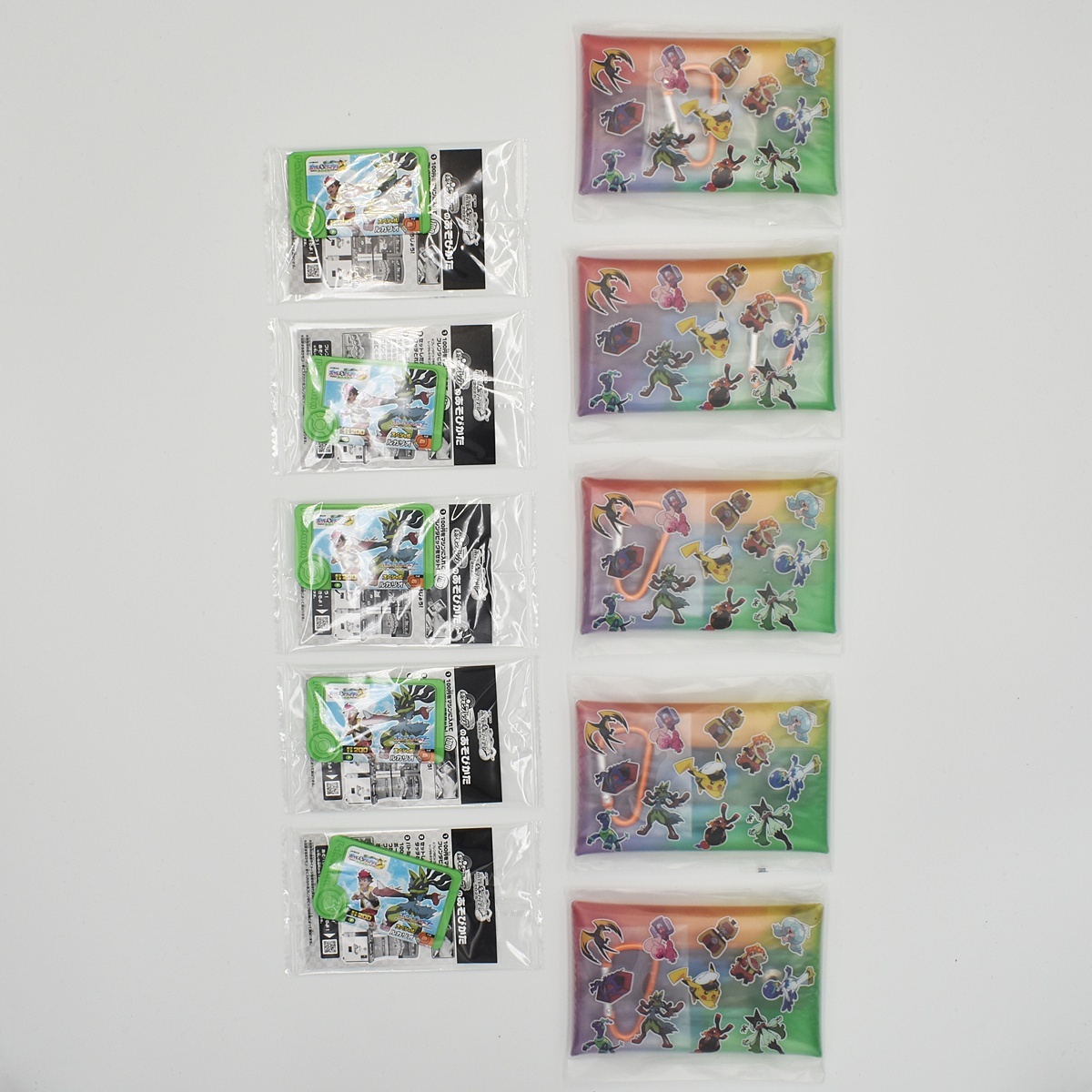 黄色いメガルカリオのフレンダピックと、ポケモンたちがデザインされたスペシャルクリアマルチケースの2点が5組セットになっています。