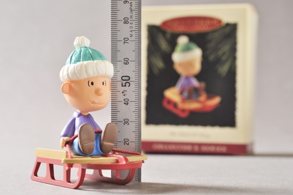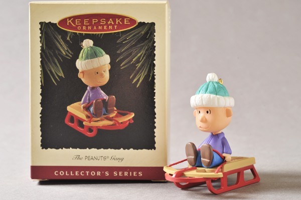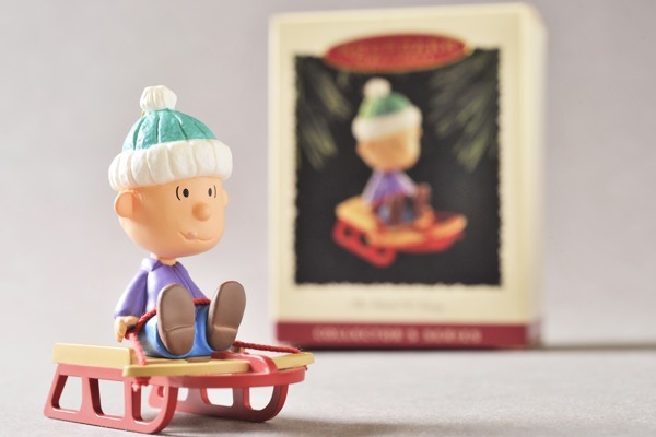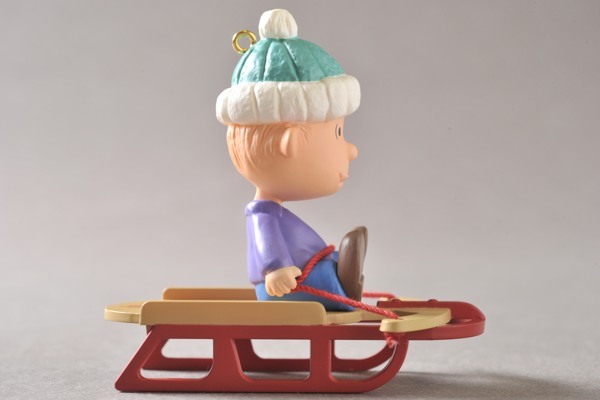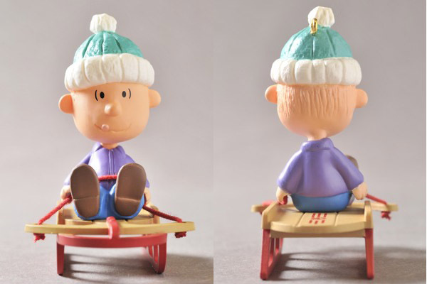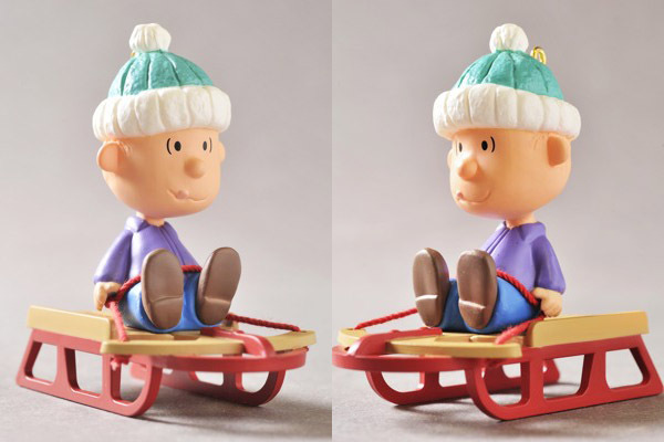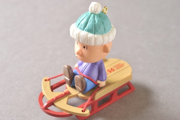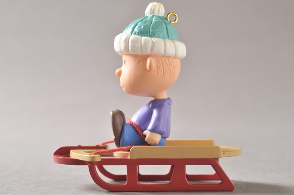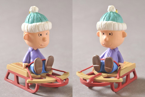 そりに乗ったライナスがかわいいクリスマスオーナメントです。