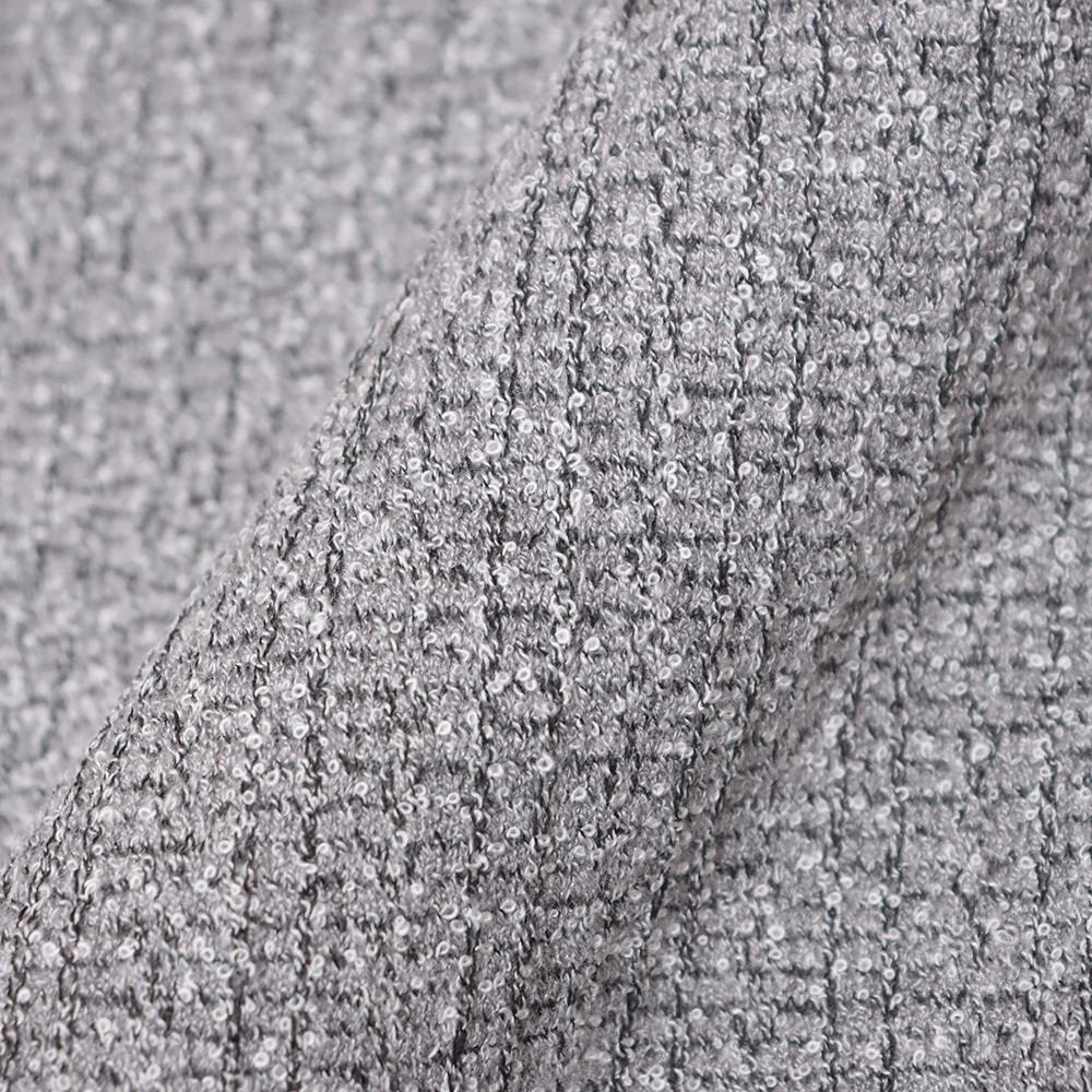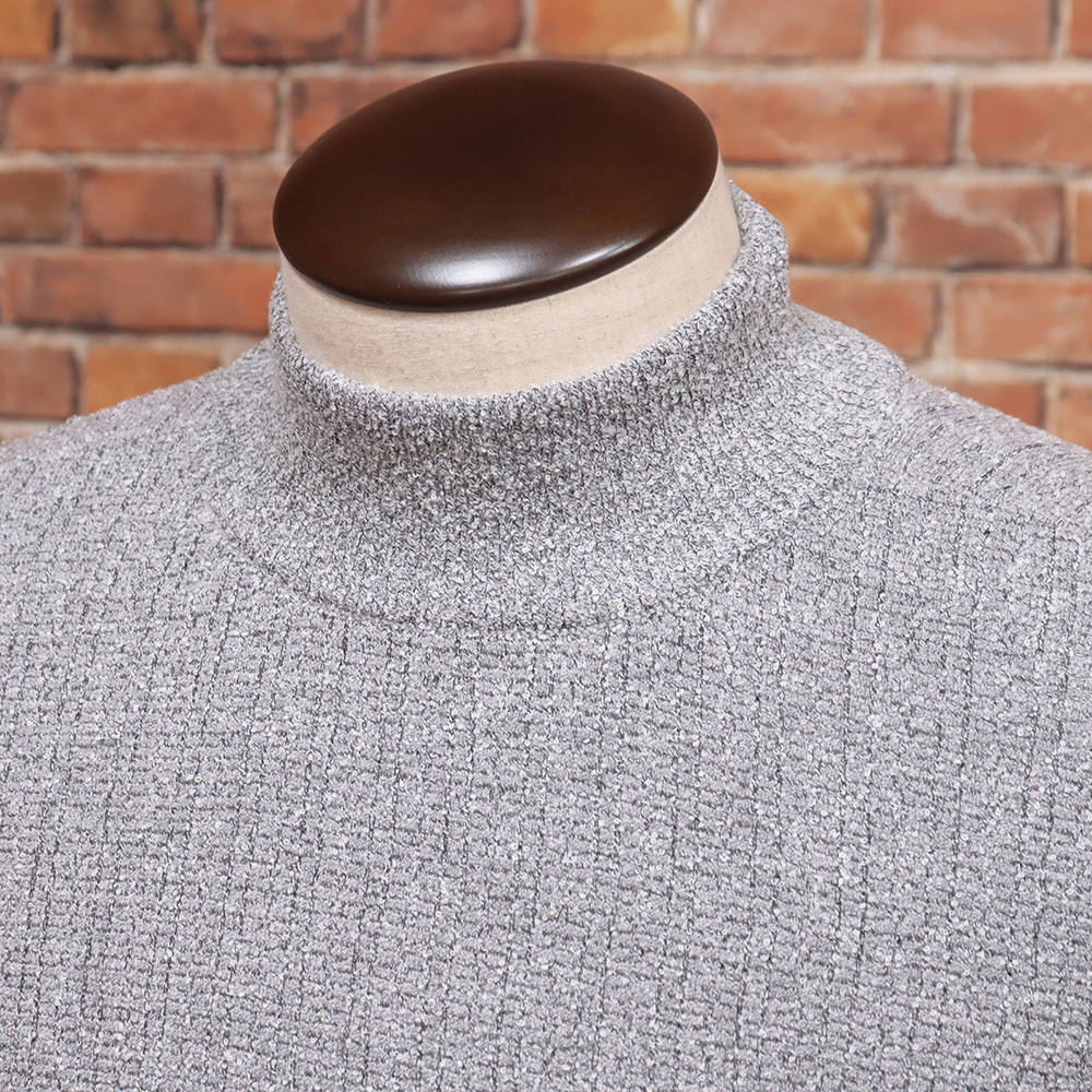 レーヨン、アクリル、ポリエステル、ナイロンをブレンドしたブークレーニット素材で仕立てたハイネックニット。ふんわりとした立体感とやわらかな表情が特徴で、見た目にもあたたかみのある一枚です。