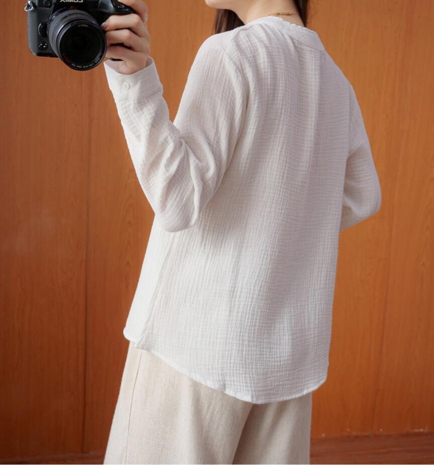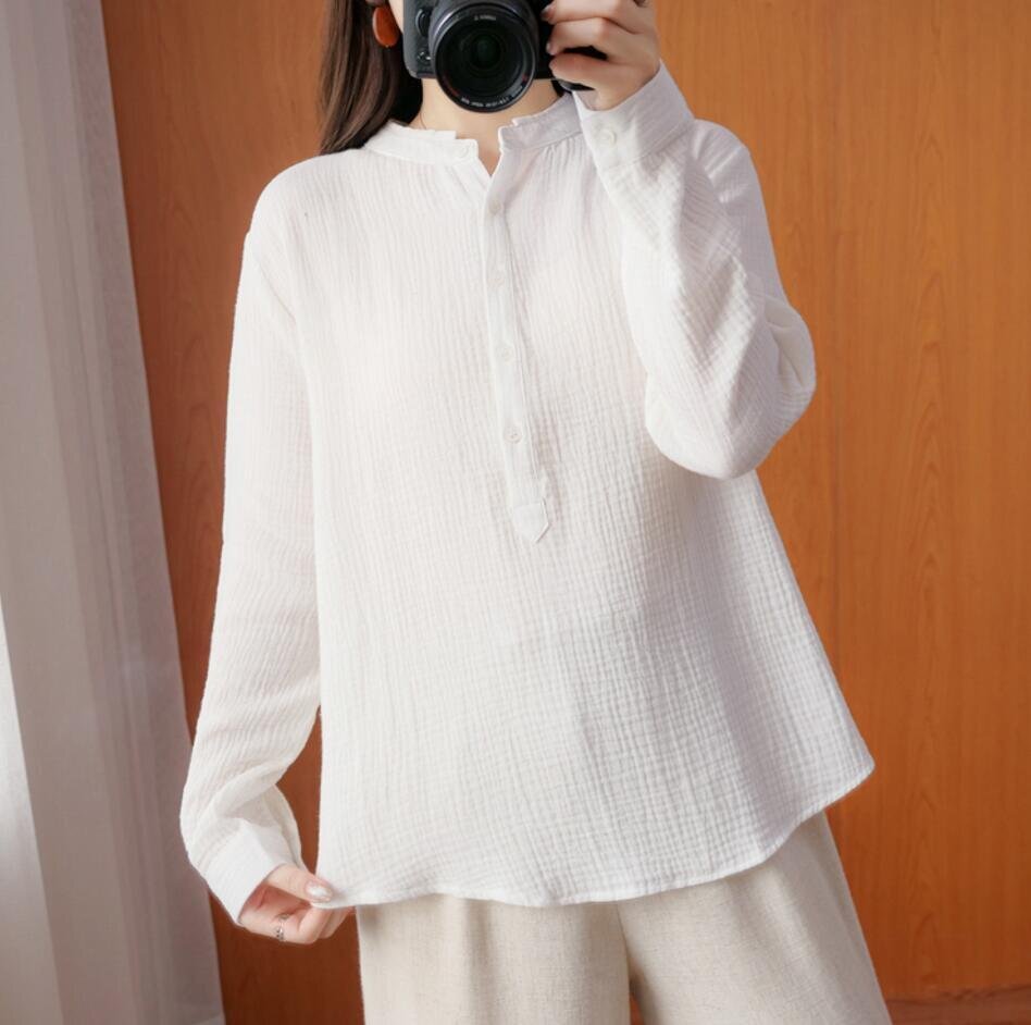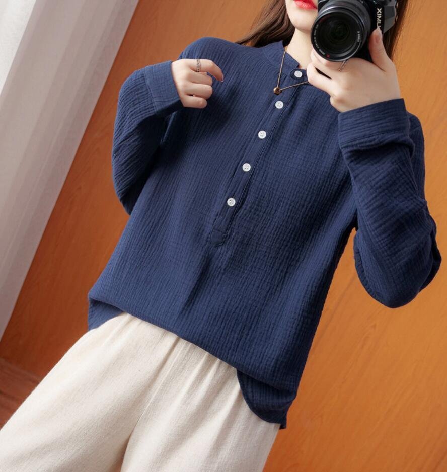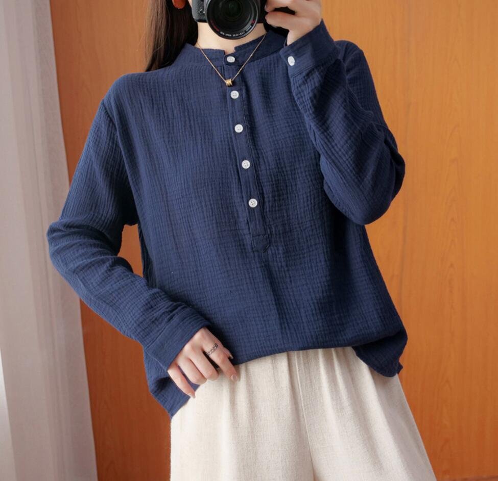 春新作 カジュアル 綿麻 ブラウス 可愛い 大人 通勤通学 長袖 トップス シンプル チュニック★ネイビー /XLサイズ