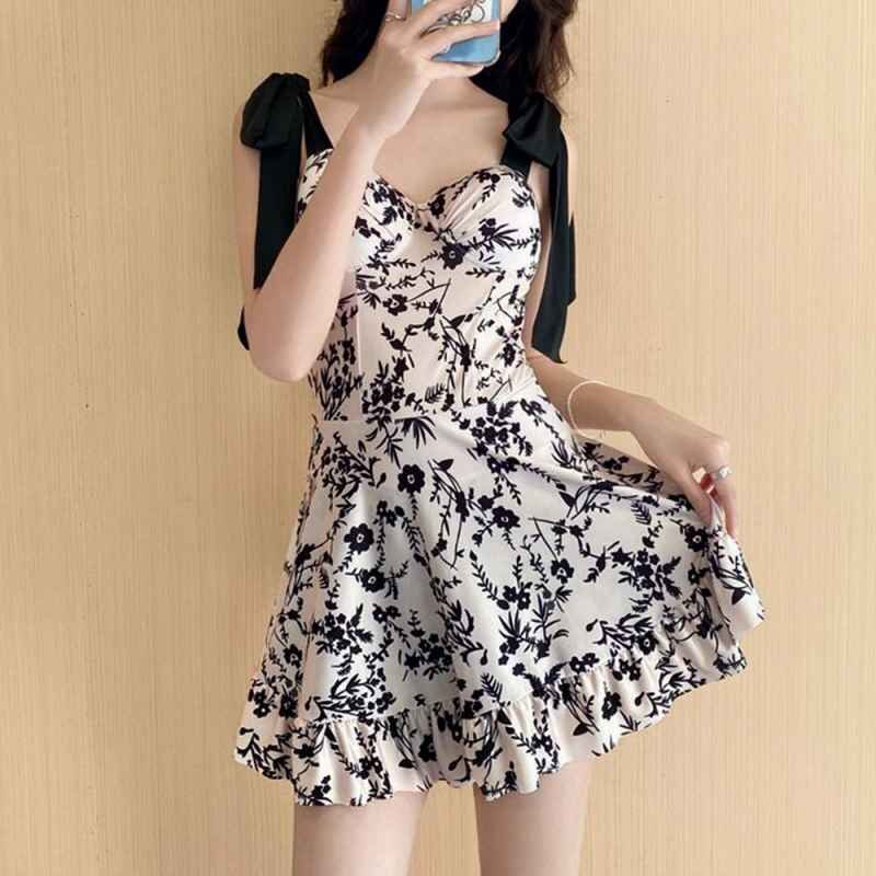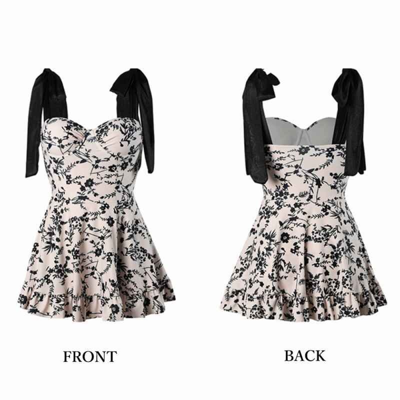 上品でシックな色合いと花柄できれいめな中に、肩のリボンがかわいらしいアクセントに。