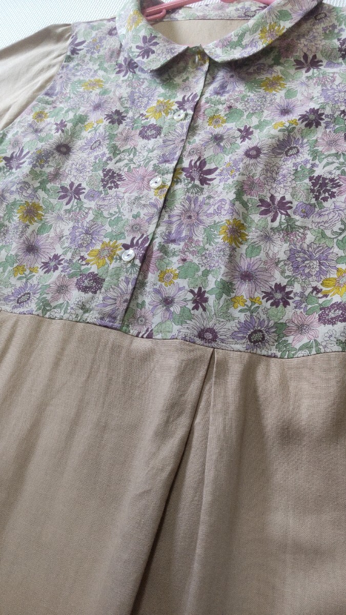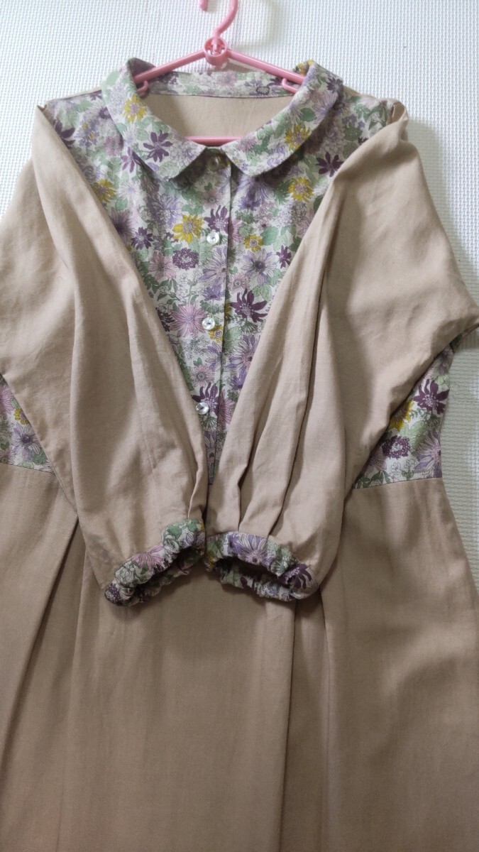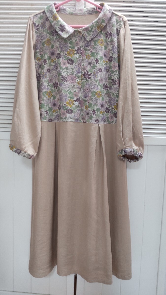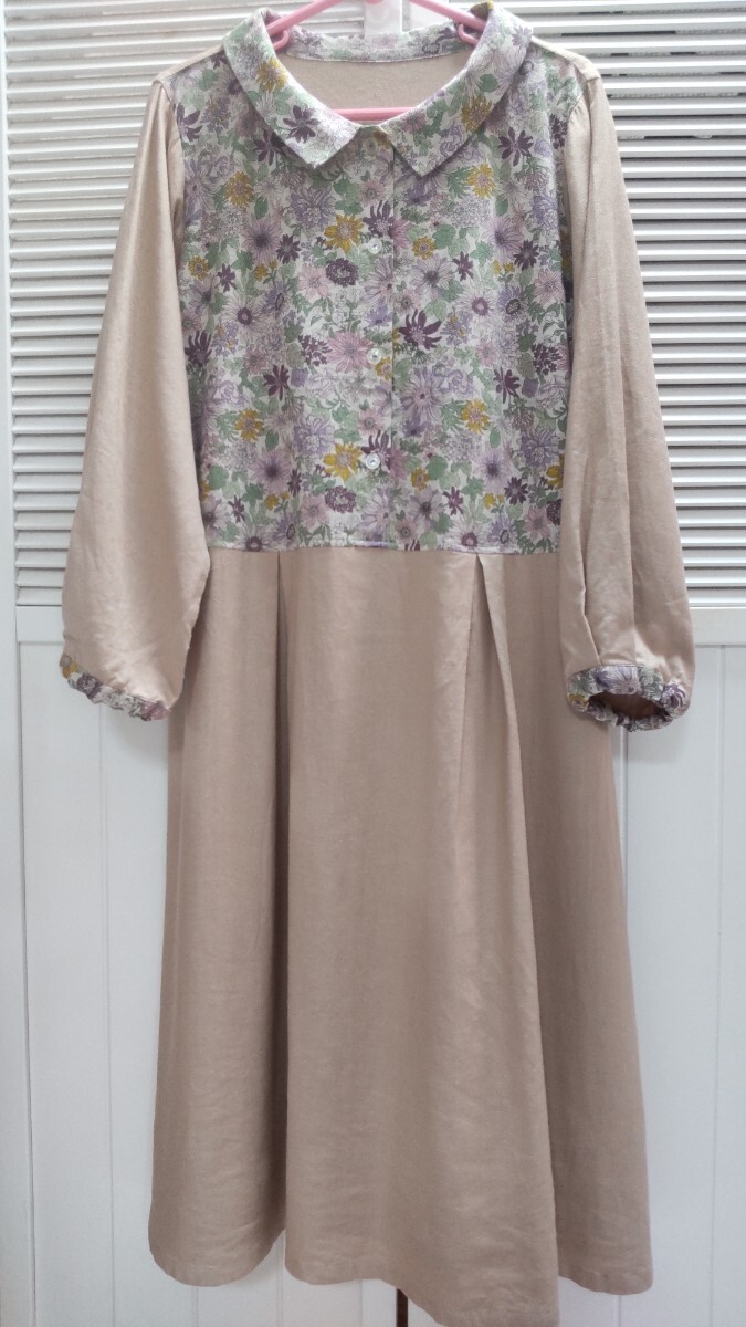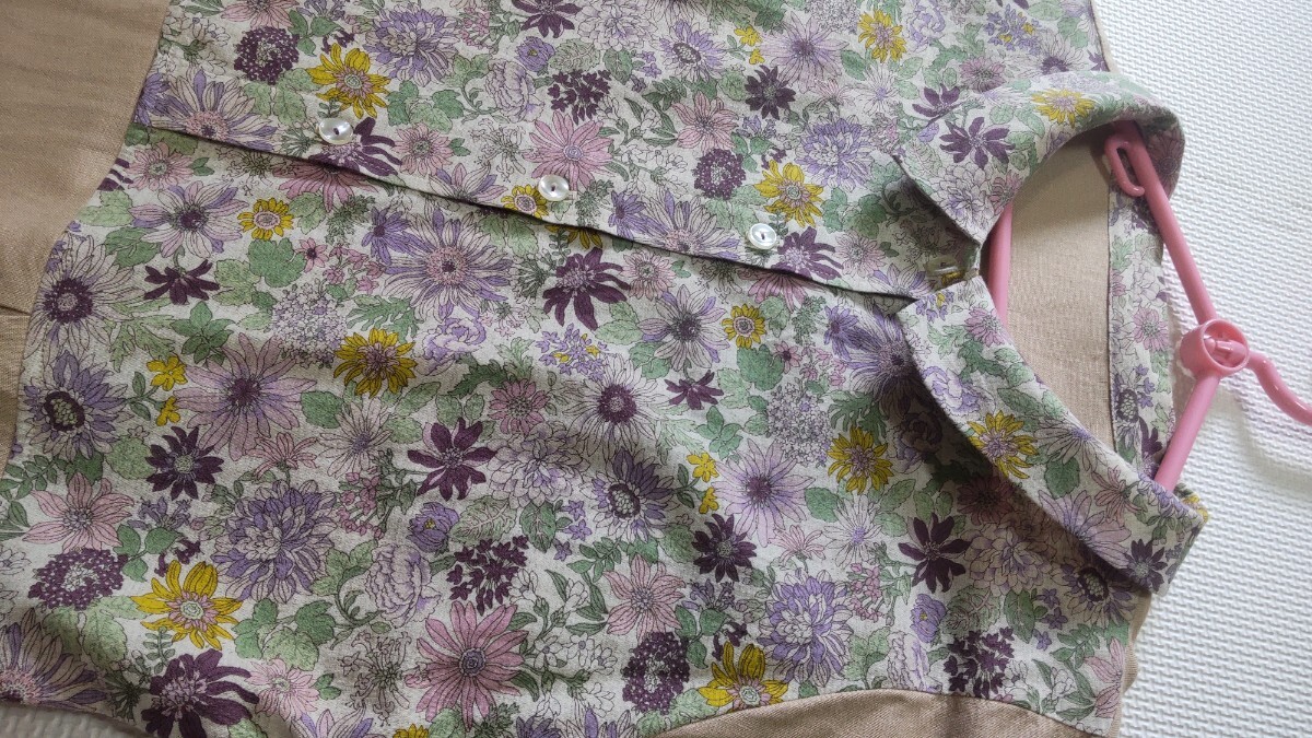 リネンレーヨン素材ベージュ(きれいな肌色)に、ピンクやパープル系の綿麻小花柄です。