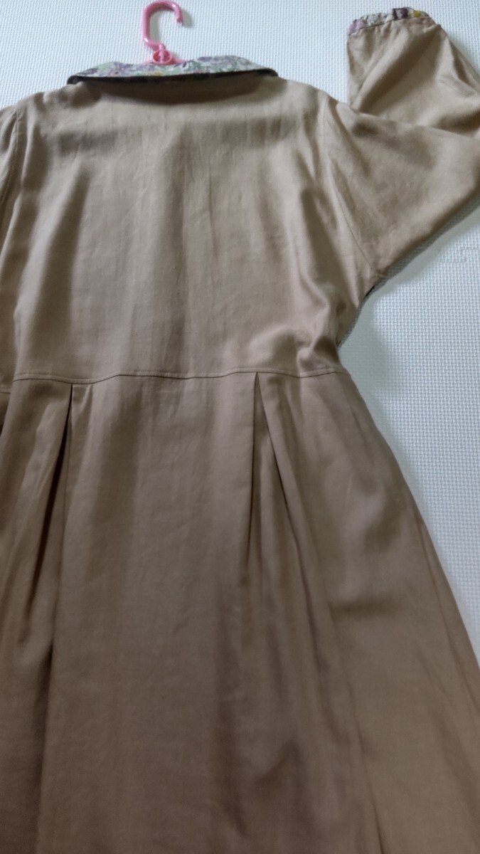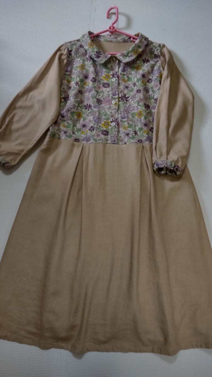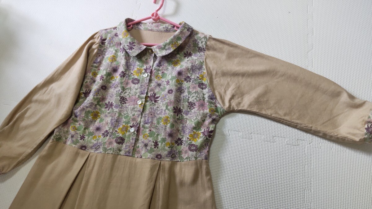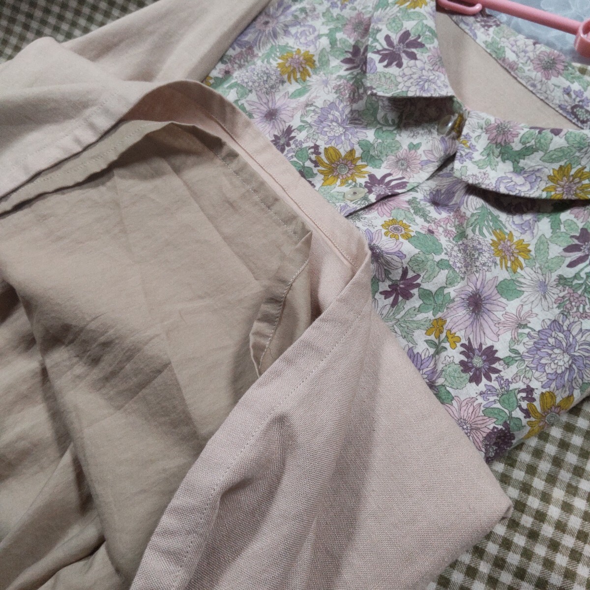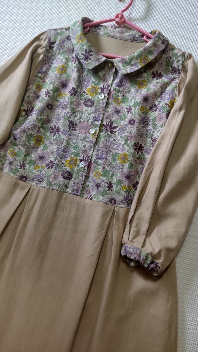 リネンレーヨン素材ベージュ(きれいな肌色)に、ピンクやパープル系の綿麻小花柄です。
