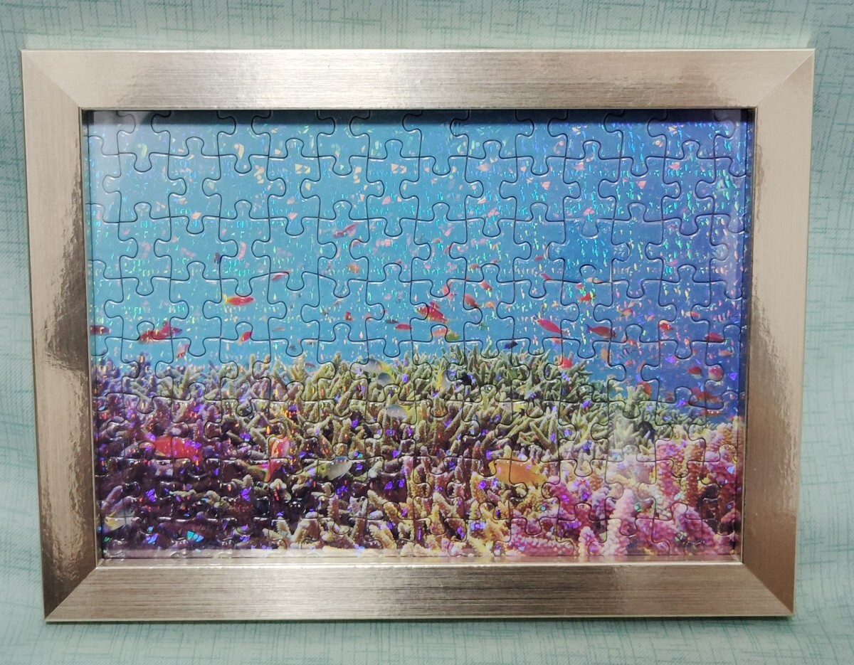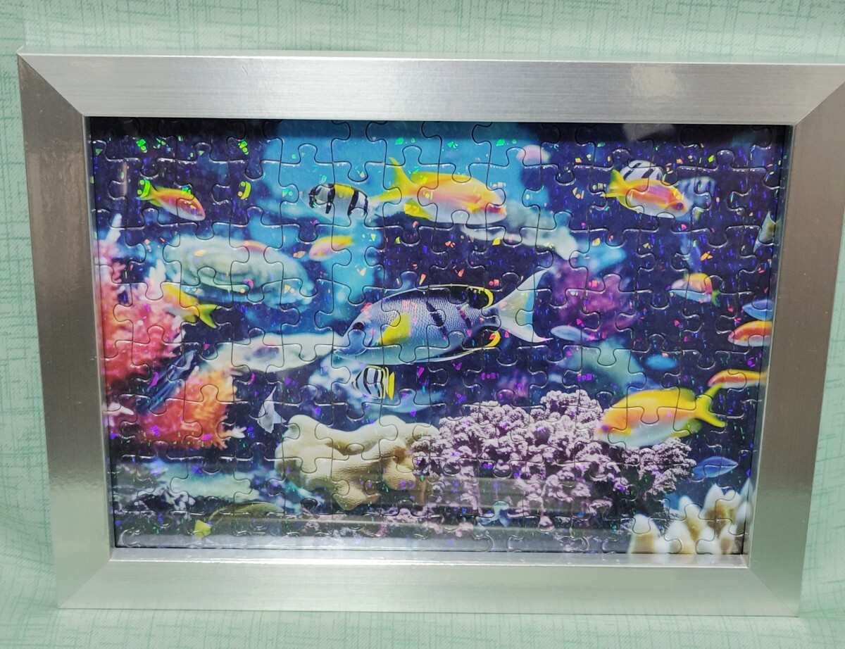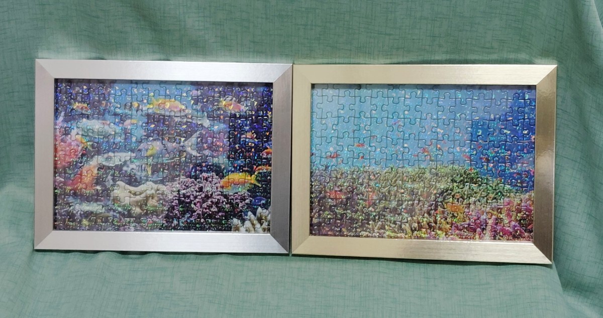 海の生物をテーマにした色鮮やかなジグソーパズル2点セット、銀色のフレーム付き。