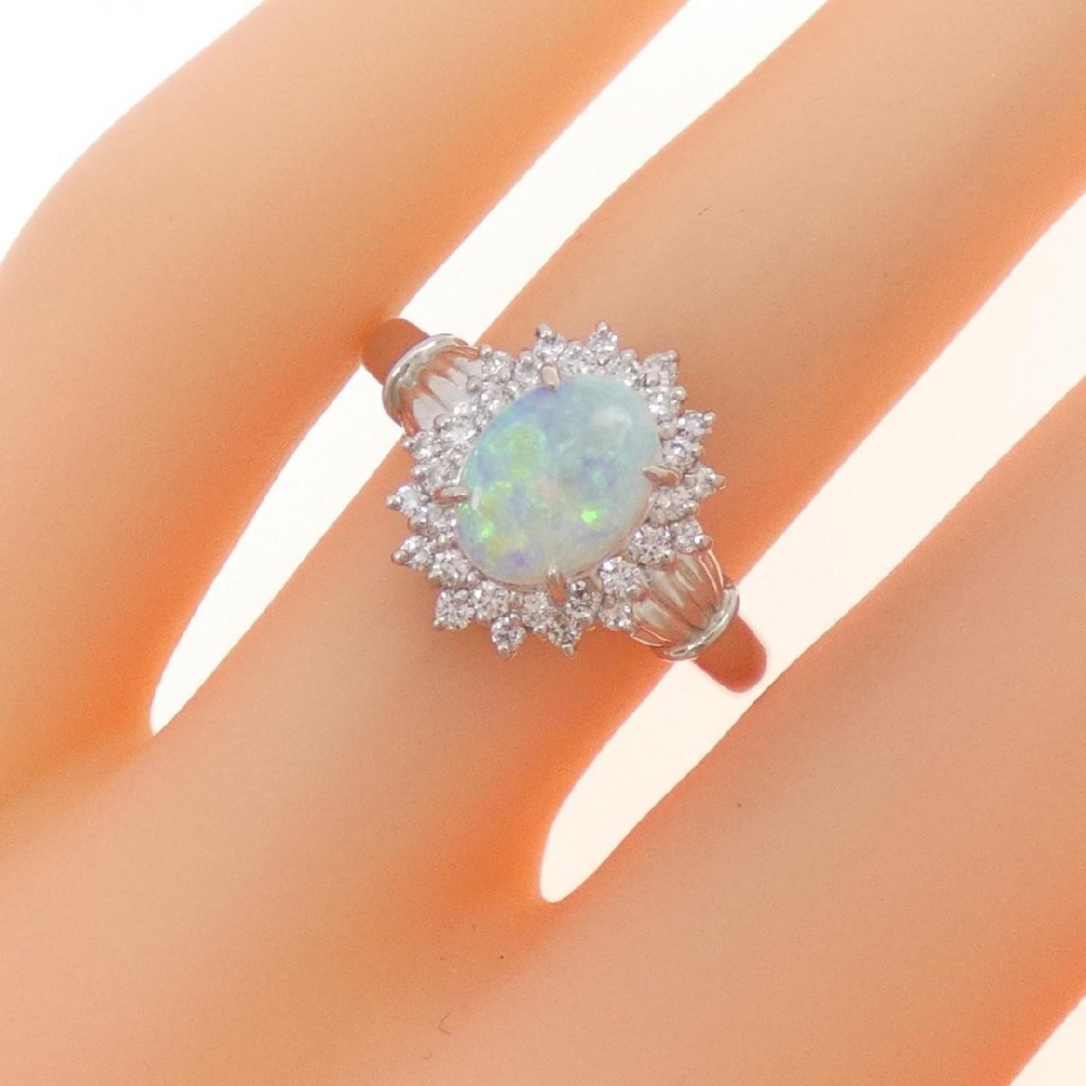 グリーン、ブルー、オレンジの遊色効果が浮かぶオパールのリング。煌めくダイヤモンドが周囲を取り巻き、気品ある指元を演出します。