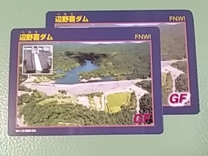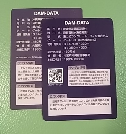 辺野喜ダムのダムカード2種類。画像で確認してください。Ver1,0とVer1,1です。カードは4枚まで同梱できます。不明な点はご質問ください。保護ラップに入れ厚紙で保護してミニレターで発送します。