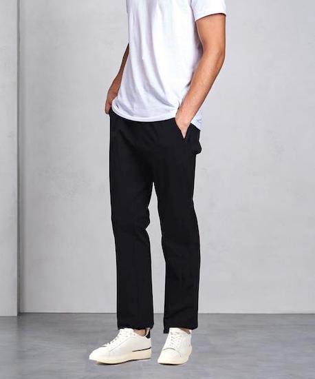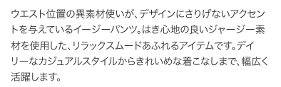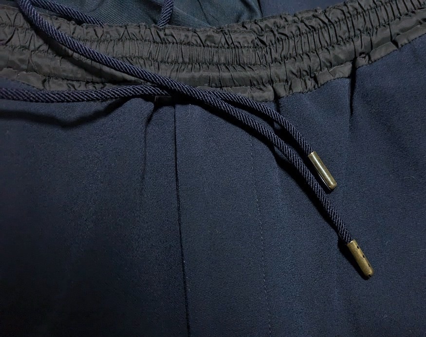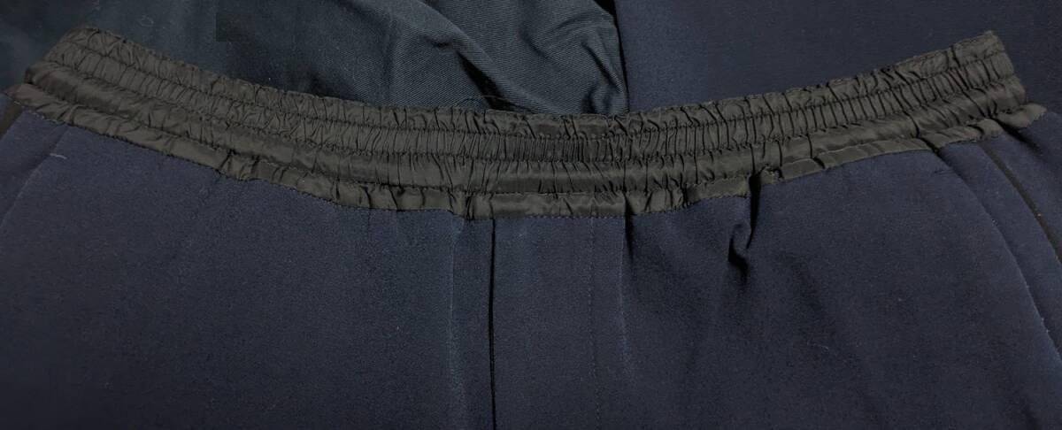 UNITED ARROWS TOKYO。ジャージー素材&ウエストイージー仕様のパンツでワンマイルウエアとしても◎。ウエストゴムでラクチンな履き心地。サイドにライン(パイピング)が入っていますが、ダークトーンなので大人っぽく履けます。ネイビー。Sサイズ(w最大85, 股上24, 股下65,ワタリ30.5cm,裾幅17cm)。目立つ傷汚れありません。