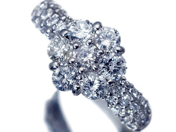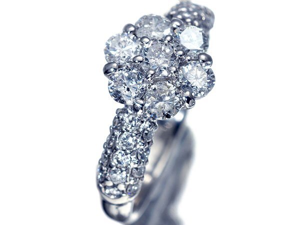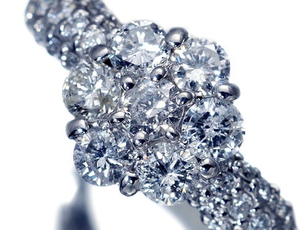 煌めくフラワーデザインに天然ダイヤモンド総計1.19ctを素敵に宝飾した、高級Pt900リングを1円から特別大放出致します!
