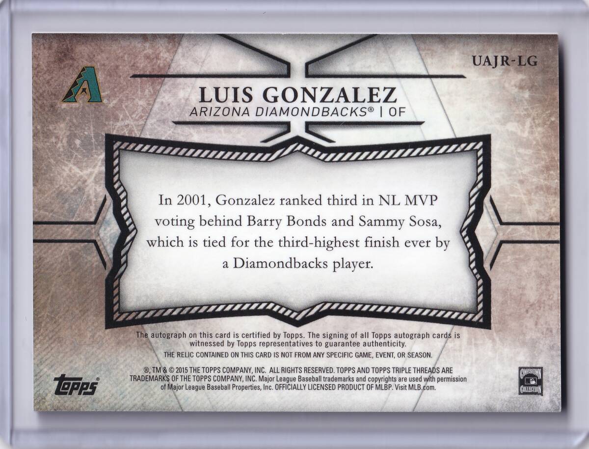 LUIS GONZALEZ 直筆サインカード 75枚限定 2015 TOPPS TRIPLE THREADS AUTOGRAPHED RELIC CARD / ルイス・ゴンザレス / AUTO