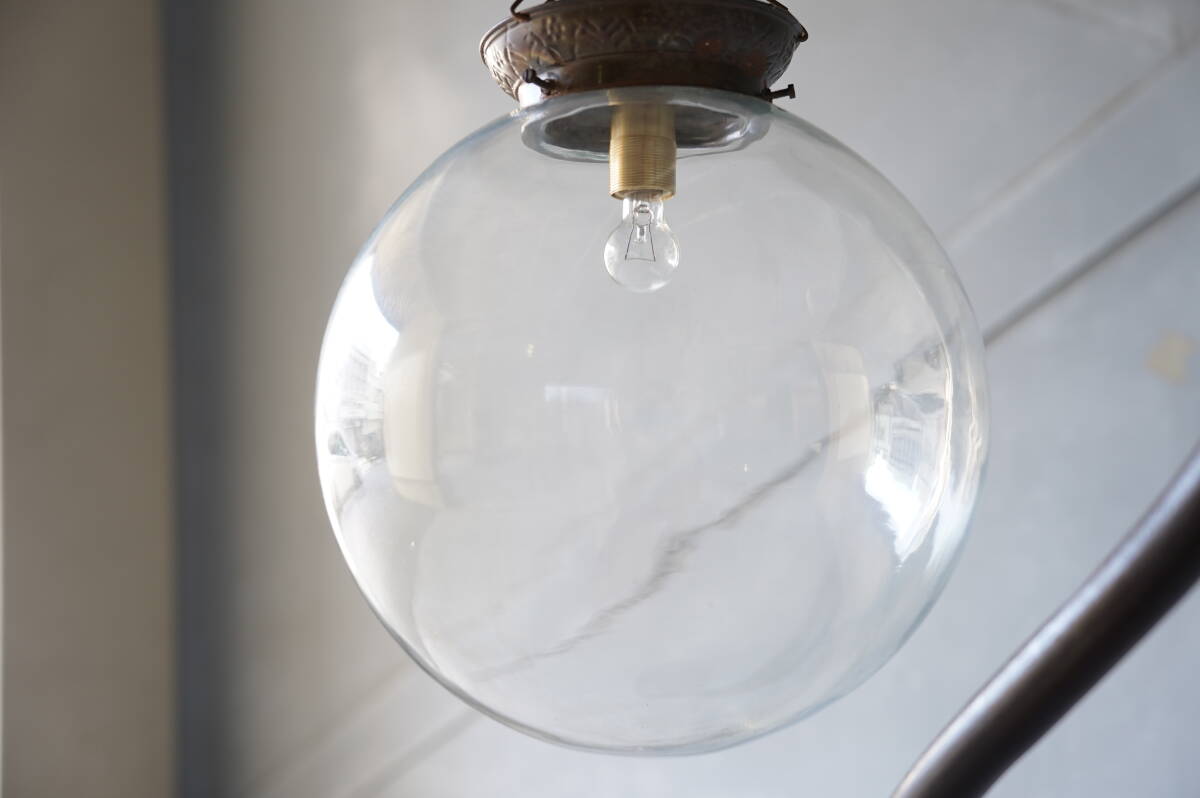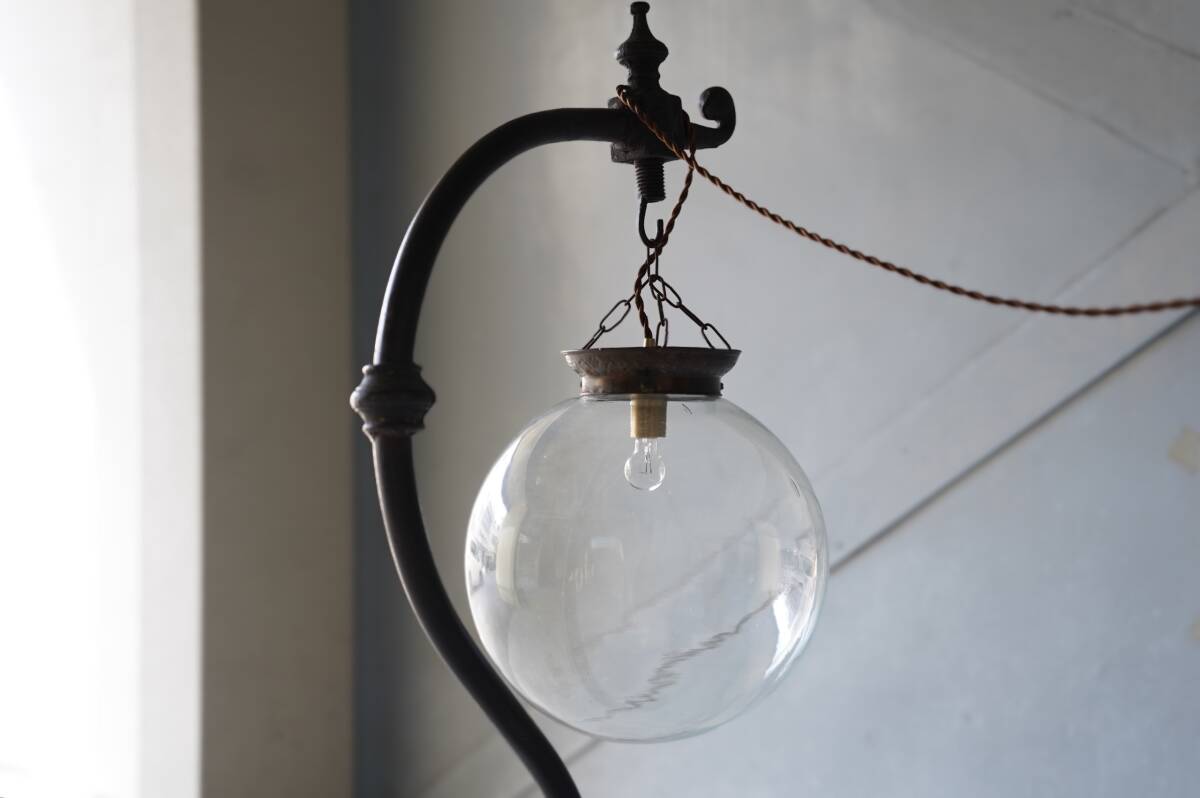 アンティークのお品物で、鉄肌は鈍く滑らかな古色で、吹きガラスのゆらゆらの繊細なガラスシェードがとても美しいです。