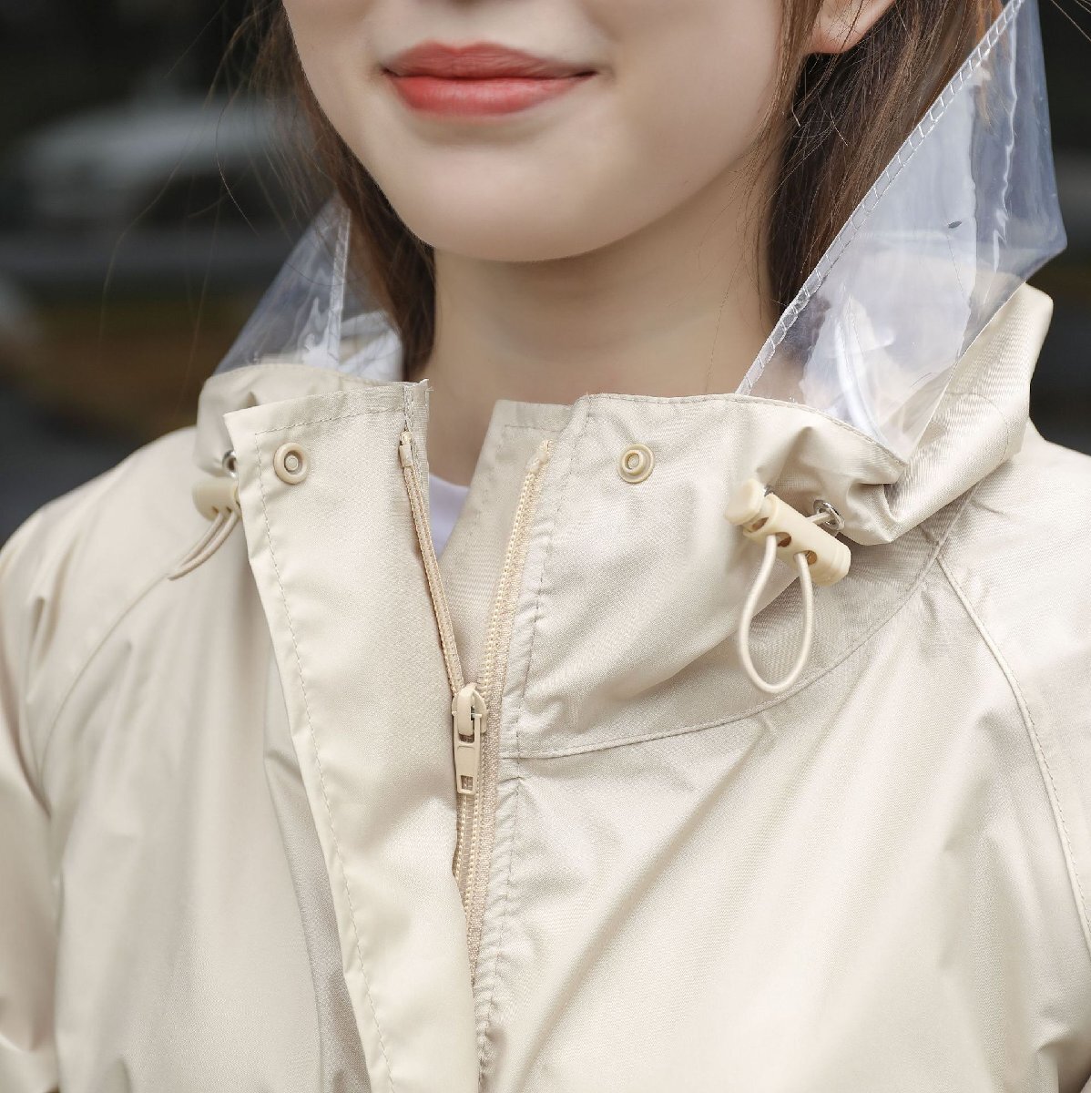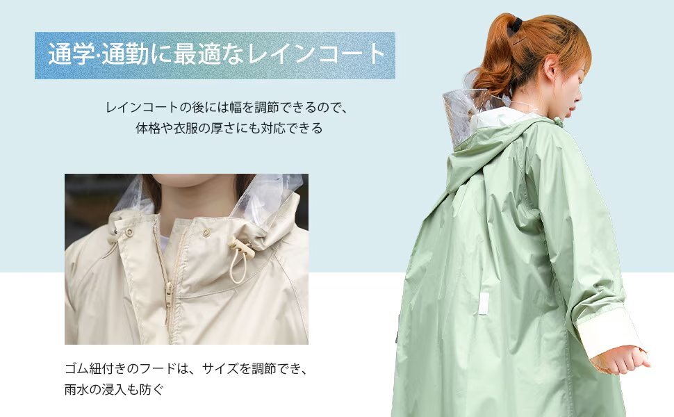 【調節可能と二重袖】裾とフードにはゴム紐がついているので、強い風でも巻きにくくなります。 レインコートの後には幅を調節できるので、体格や衣服の厚さにも対応できます。二重袖を採用することで、風や雨が入りにくくなります。
