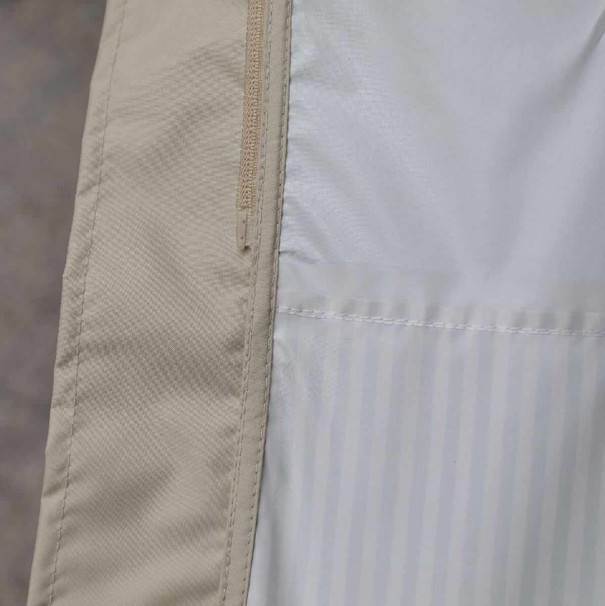 【超撥水性、耐久性】縫目には雨の侵入を防ぐ防水テープを加工します。ファスナー+ボタンの二重デザインで、ファスナーを閉じてボタンをかけることで雨水や風の侵入をしっかり防げるレインコートです。